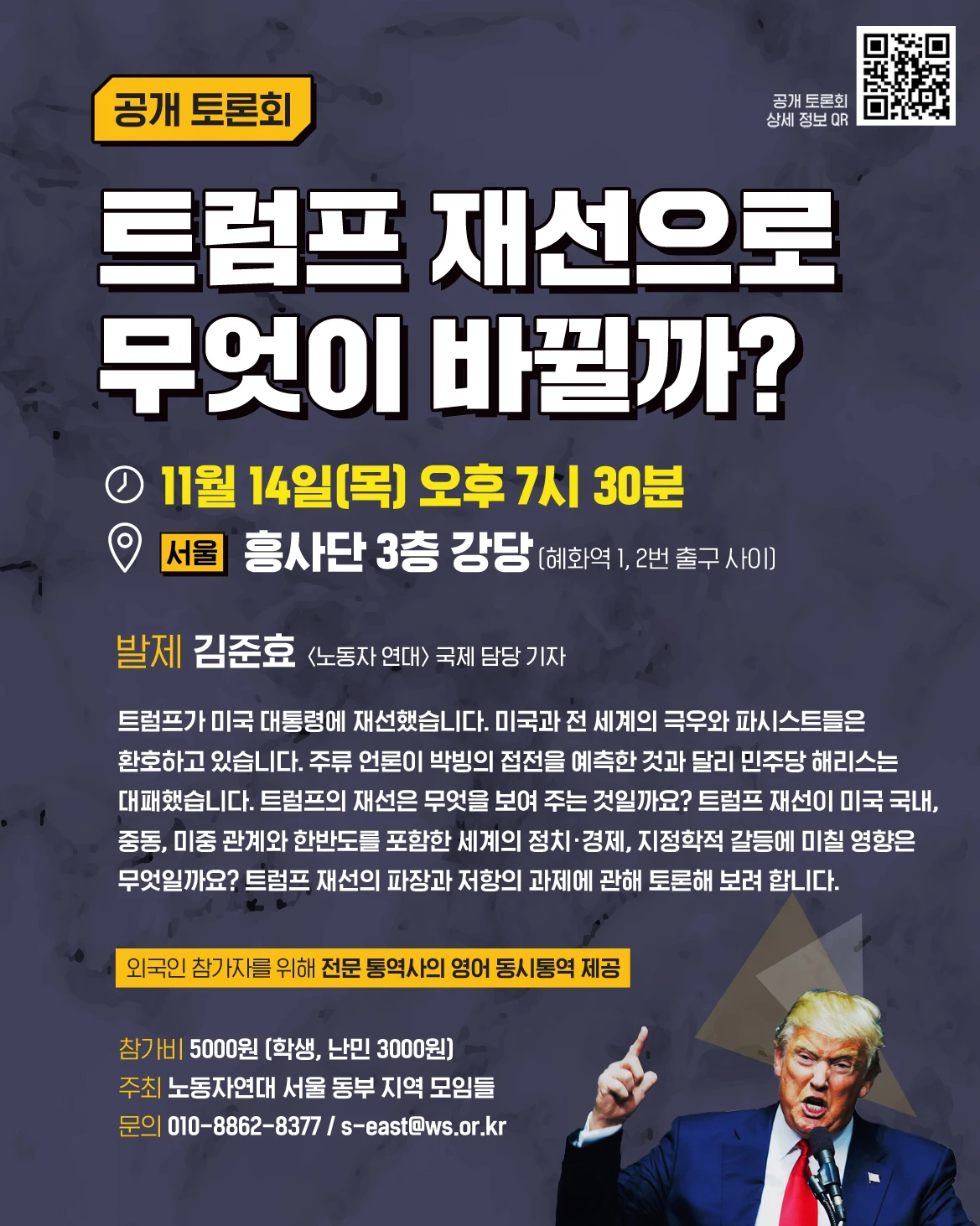 트럼프가 미국 대통령에 재선했습니다. 미국과 전 세계의 극우와 파시스트들은 환호하고 있습니다. 주류 언론이 박빙의 접전을 예측한 것과 달리 민주당 해리스는 대패했습니다. 트럼프의 재선은 무엇을 보여 주는 것일까요? 트럼프 재선이 미국 국내, 중동, 미중 관계와 한반도를 포함한 세계의 정치·경제, 지정학적 갈등에 미칠 영향은 무엇일까요? 트럼프 재선의 파장과 저항의 과제에 관해 토론해 보려 합니다.