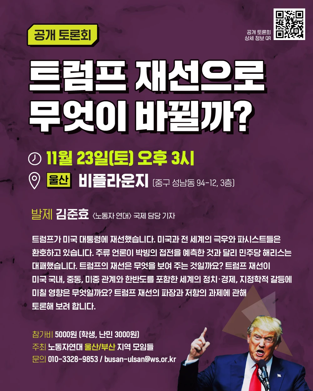 👉 [공개 토론회] 트럼프 재선으로 무엇이 바뀔까? https://ws.or.kr/forum/33584 📌 일시: 2024년 11월 23일(토) 오후 3시 📌 발제자: 김준효 (〈노동자 연대〉 국제 담당 기자) 📌 장소: 울산 비플라운지(중구 성남동 94-12, 3층) 📌 참가비: 5000원 (학생, 난민 3000원) 💬 트럼프가 미국 대통령에 재선했습니다. 미국과 전 세계의 극우와 파시스트들은 환호하고 있습니다. 주류 언론이 박빙의 접전을 예측한 것과 달리 민주당 해리스는 대패했습니다. 트럼프의 재선은 무엇을 보여 주는 것일까요? 트럼프 재선이 미국 국내, 중동, 미중 관계와 한반도를 포함한 세계의 정치·경제, 지정학적 갈등에 미칠 영향은 무엇일까요? 트럼프 재선의 파장과 저항의 과제에 관해 토론해 보려 합니다. 🔺 주최: 노동자연대 울산/부산 지역 모임들 🔺 문의: 010-3328-9853 / busan-ulsan@ws.or.kr