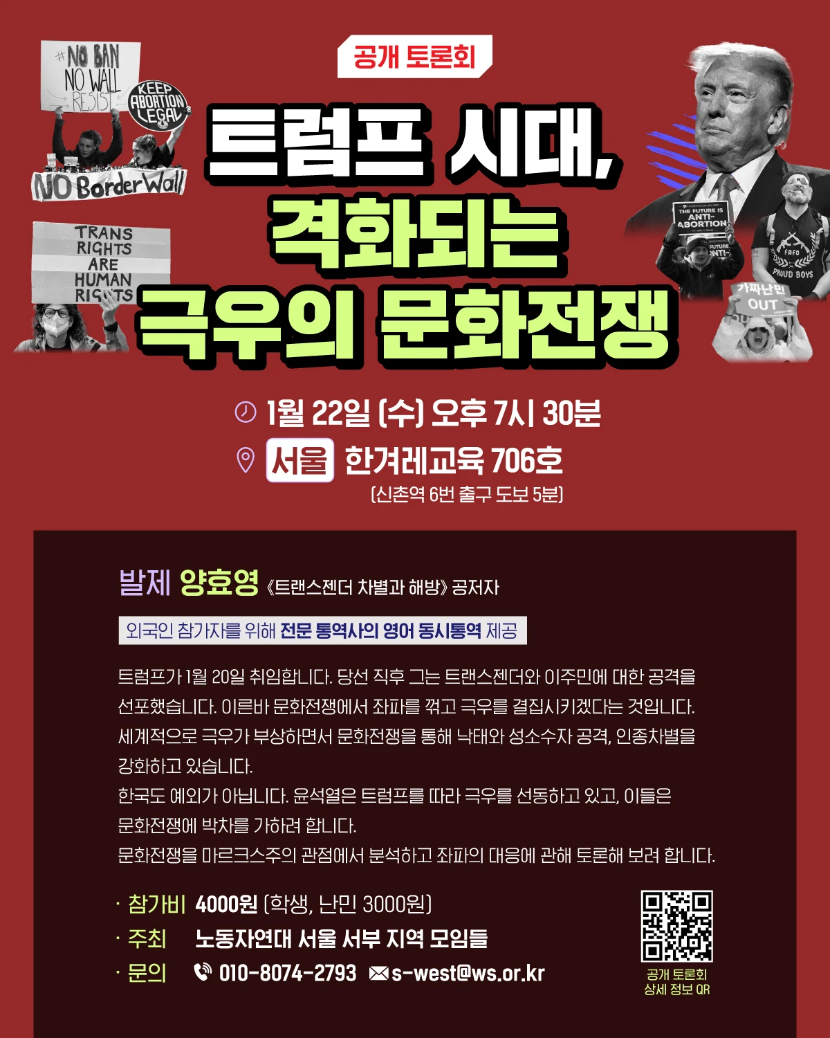 한국도 예외가 아닙니다. 윤석열은 트럼프를 따라 극우를 선동하고 있고, 이들은 문화전쟁에 박차를 가하려 합니다.