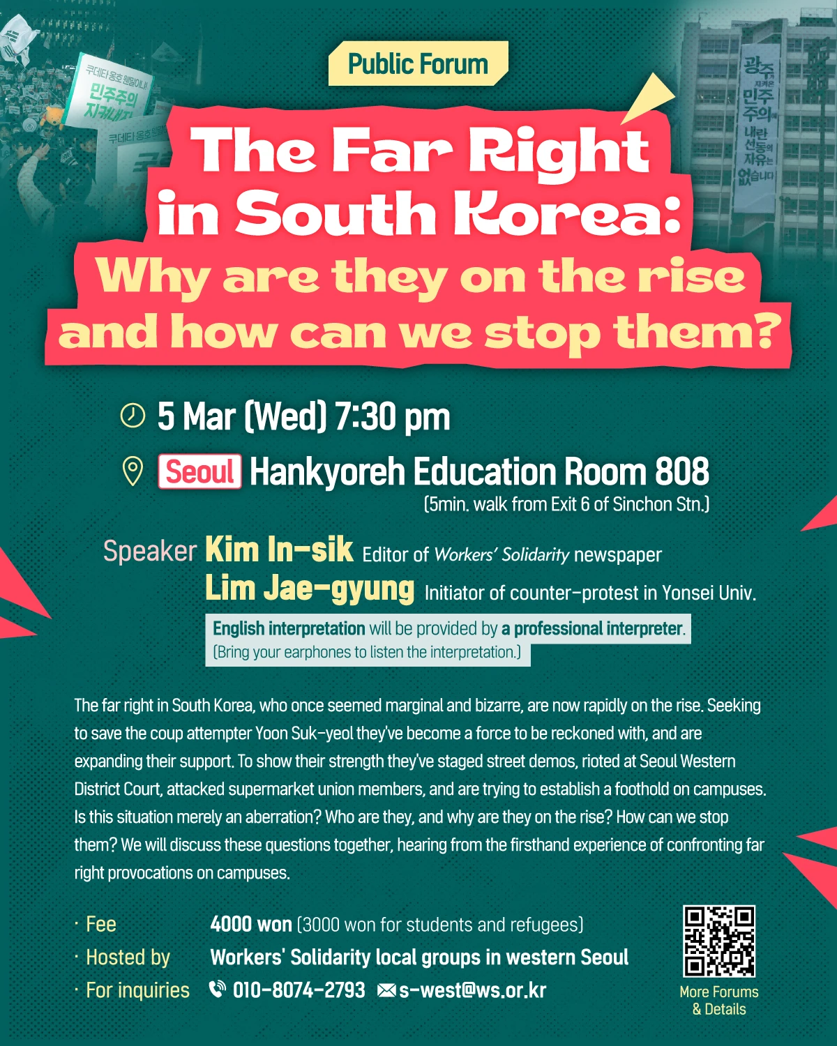 The far right in South Korea, who once seemed marginal and bizarre, are now rapidly on the rise. Seeking to save the coup attempter Yoon Suk-yeol they've become a force to be reckoned with, and are expanding their support. To show their strength they've staged street demos, rioted at Seoul Western District Court, attacked supermarket union members, and are trying to establish a foothold on campuses.