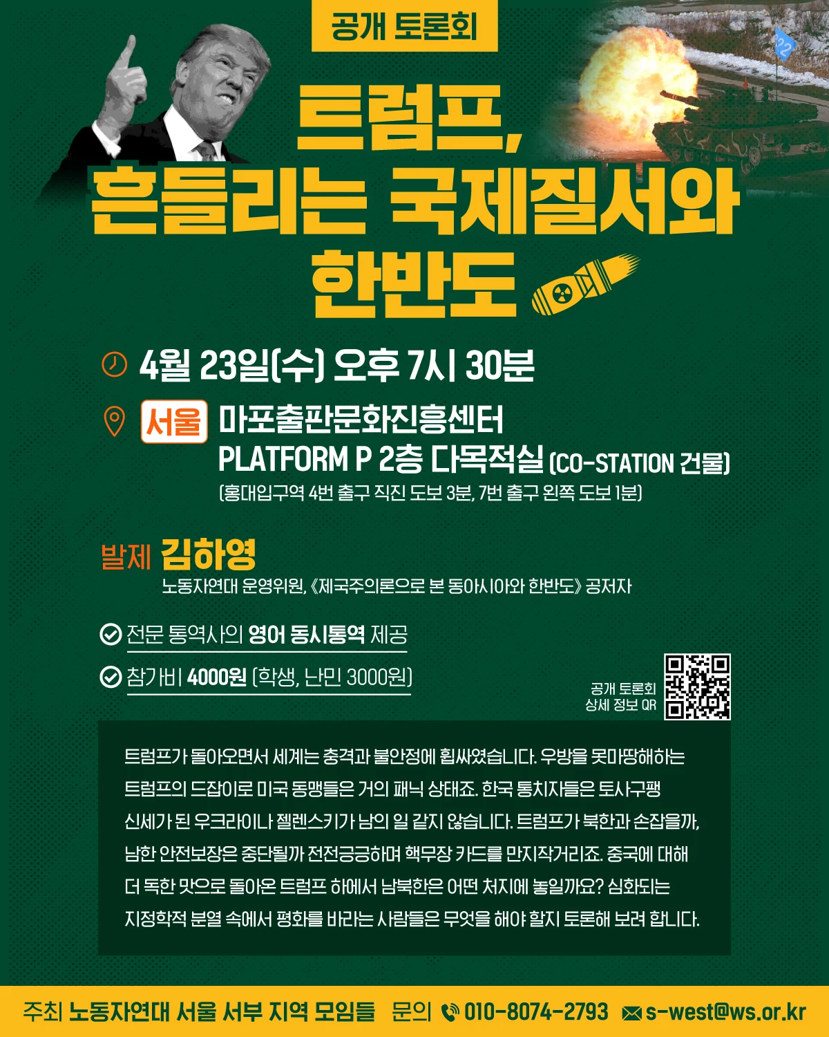 트럼프가 돌아오면서 세계는 충격과 불안정에 휩싸였습니다. 우방을 못마땅해하는 트럼프의 드잡이로 미국 동맹들은 거의 패닉 상태죠. 한국 통치자들은 토사구팽 신세가 된 우크라이나 젤렌스키가 남의 일 같지 않습니다. 트럼프가 북한과 손잡을까, 남한 안전보장은 중단될까 전전긍긍하며 핵무장 카드를 만지작거리죠. 중국에 대해 더 독한 맛으로 돌아온 트럼프 하에서 남북한은 어떤 처지에 놓일까요? 심화되는 지정학적 분열 속에서 평화를 바라는 사람들은 무엇을 해야 할지 토론해 보려 합니다.