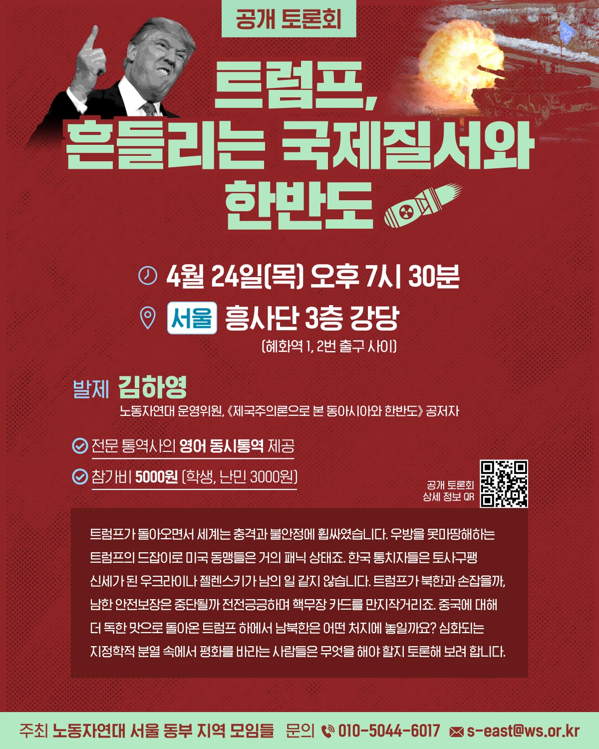 트럼프가 돌아오면서 세계는 충격과 불안정에 휩싸였습니다. 우방을 못마땅해하는 트럼프의 드잡이로 미국 동맹들은 거의 패닉 상태죠. 한국 통치자들은 토사구팽 신세가 된 우크라이나 젤렌스키가 남의 일 같지 않습니다. 트럼프가 북한과 손잡을까, 남한 안전보장은 중단될까 전전긍긍하며 핵무장 카드를 만지작거리죠. 중국에 대해 더 독한 맛으로 돌아온 트럼프 하에서 남북한은 어떤 처지에 놓일까요? 심화되는 지정학적 분열 속에서 평화를 바라는 사람들은 무엇을 해야 할지 토론해 보려 합니다.