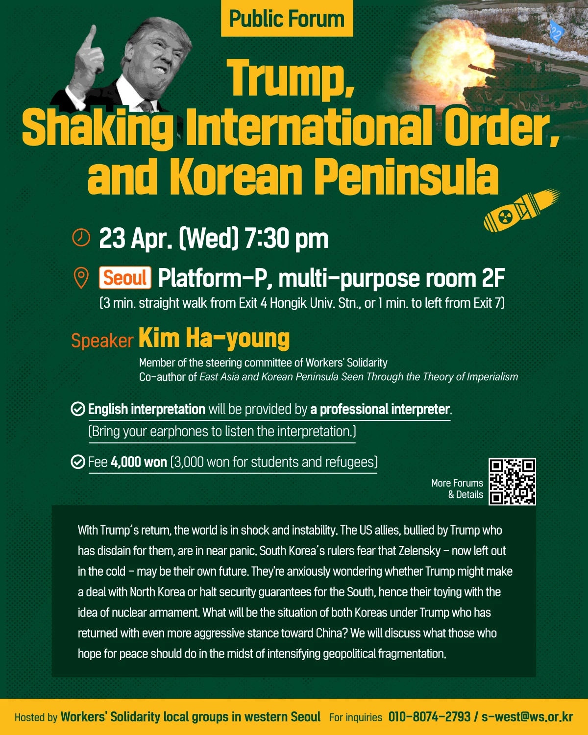 With Trump’s return, the world is in shock and instability. The US allies, bullied by Trump who has disdain for them, are in near panic. South Korea’s rulers fear that Zelensky — now left out in the cold — may be their own future. They're anxiously wondering whether Trump might make a deal with North Korea or halt security guarantees for the South, hence their toying with the idea of nuclear armament. What will be the situation of both Koreas under Trump who has returned with even more aggressive stance toward China? We will discuss what those who hope for peace should do in the midst of intensifying geopolitical fragmentation.