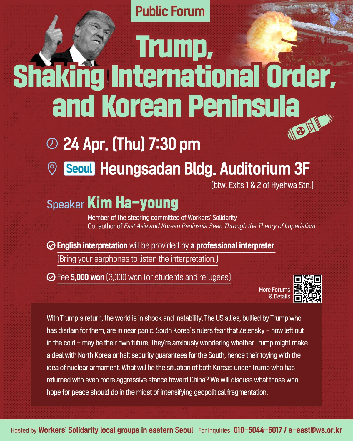 With Trump’s return, the world is in shock and instability. The US allies, bullied by Trump who has disdain for them, are in near panic. South Korea’s rulers fear that Zelensky — now left out in the cold — may be their own future. They're anxiously wondering whether Trump might make a deal with North Korea or halt security guarantees for the South, hence their toying with the idea of nuclear armament. What will be the situation of both Koreas under Trump who has returned with even more aggressive stance toward China? We will discuss what those who hope for peace should do in the midst of intensifying geopolitical fragmentation.