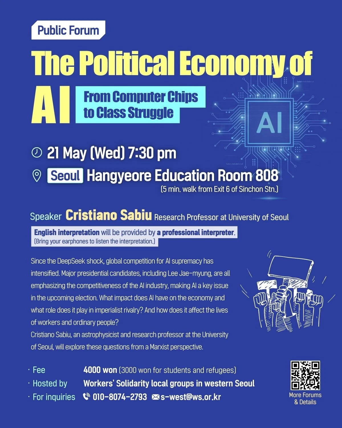 Since the DeepSeek shock, global competition for AI supremacy has intensified. Major presidential candidates, including Lee Jae-myung, are all emphasizing the competitiveness of the AI industry, making AI a key issue in the upcoming election. What impact does AI have on the economy and what role does it play in imperialist rivalry? And how does it affect the lives of workers and ordinary people?