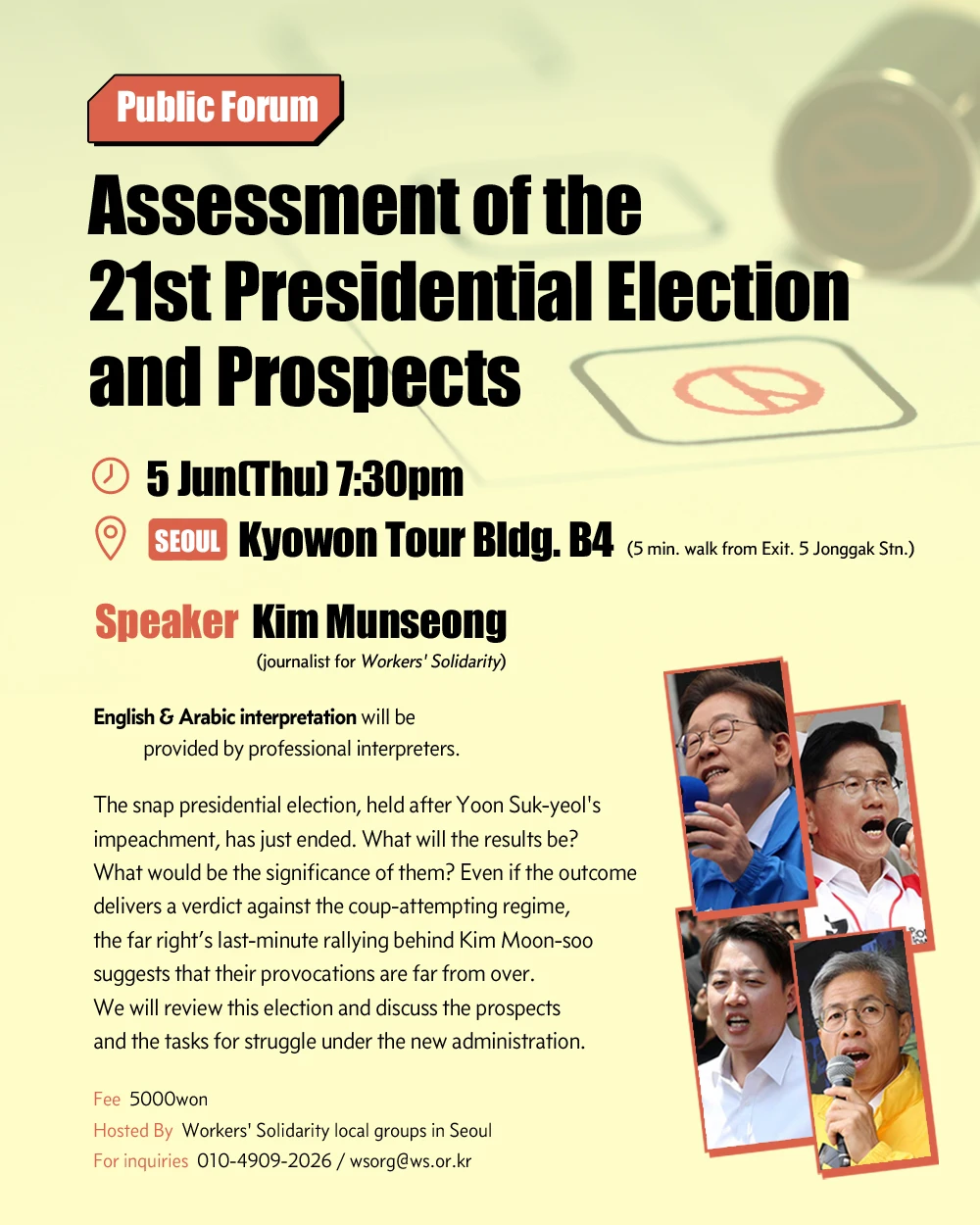 The snap presidential election, held after Yoon Suk-yeol's impeachment, has just ended. What will the results be? What would be the significance of them? Even if the outcome delivers a verdict against the coup-attempting regime, the far right’s last-minute rallying behind Kim Moon-soo suggests that their provocations are far from over. We will review this election and discuss the prospects and the tasks for struggle under the new administration.