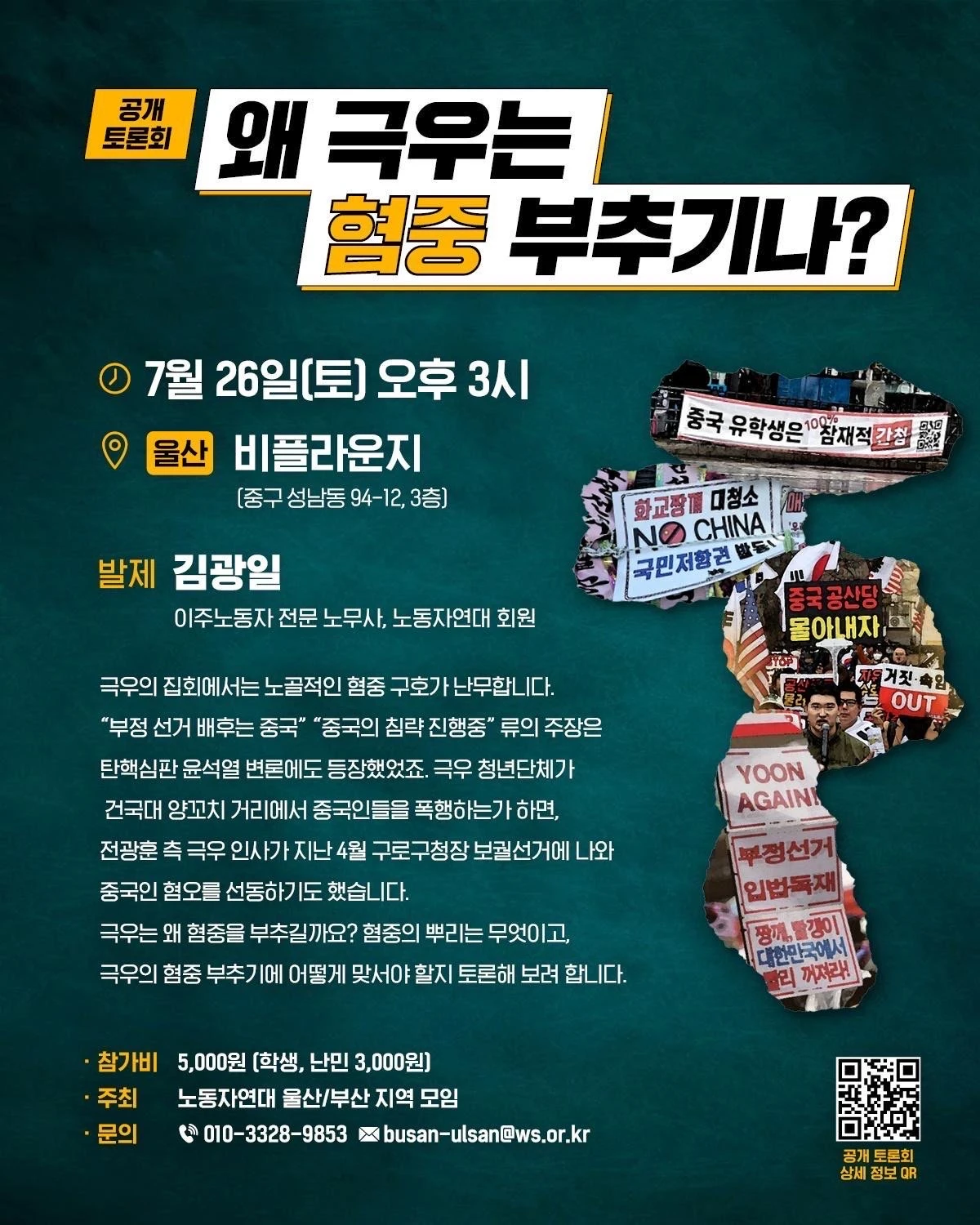 👉 [공개 토론회] 왜 극우는 혐중 부추기나? https://ws.or.kr/forum/37558 📌 일시: 2025년 7월 26일(토) 오후 3시 📌 발제자: 김광일 (이주노동자 전문 노무사, 노동자연대 회원) 📌 장소: 울산 비플라운지 (중구 성남동 94-12, 3층) 📌 참가비: 5000원 (학생, 난민 3000원) 💬 극우의 집회에서는 노골적인 혐중 구호가 난무합니다. “부정 선거 배후는 중국” “중국의 침략 진행중” 류의 주장은 탄핵심판 윤석열 변론에도 등장했었죠. 극우 청년단체가 건국대 양꼬치 거리에서 중국인들을 폭행하는가 하면, 전광훈 측 극우 인사가 지난 4월 구로구청장 보궐선거에 나와 중국인 혐오를 선동하기도 했습니다. 극우는 왜 혐중을 부추길까요? 혐중의 뿌리는 무엇이고, 극우의 혐중 부추기에 어떻게 맞서야 할지 토론해 보려 합니다. 🔺 주최: 노동자연대 울산/부산 지역 모임들 🔺 문의: 010-3328-9853 / busan-ulsan@ws.or.kr