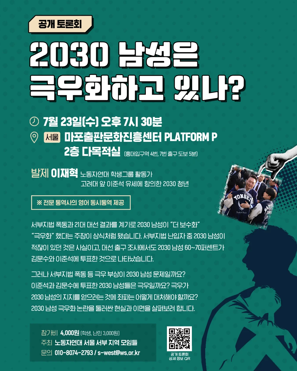 23 July(Wed) 2025, 7:30pm | Speaker: Lee Jae Hyuk (Workers' Solidarity Students Group activist, one of the 20/30s who protested Lee Jun-seok’s campaign rally near Korea Univ.)