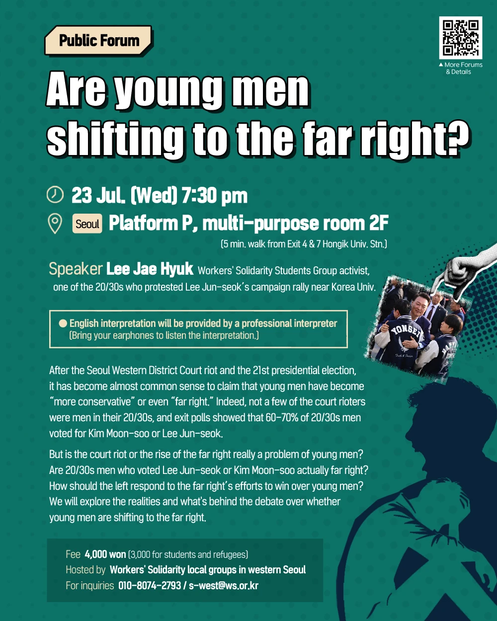 But is the court riot or the rise of the far right really a problem of young men? Are 20/30s men who voted Lee Jun-seok or Kim Moon-soo actually far right? How should the left respond to the far right’s efforts to win over young men? We will explore the realities and what's behind the debate over whether young men are shifting to the far right.