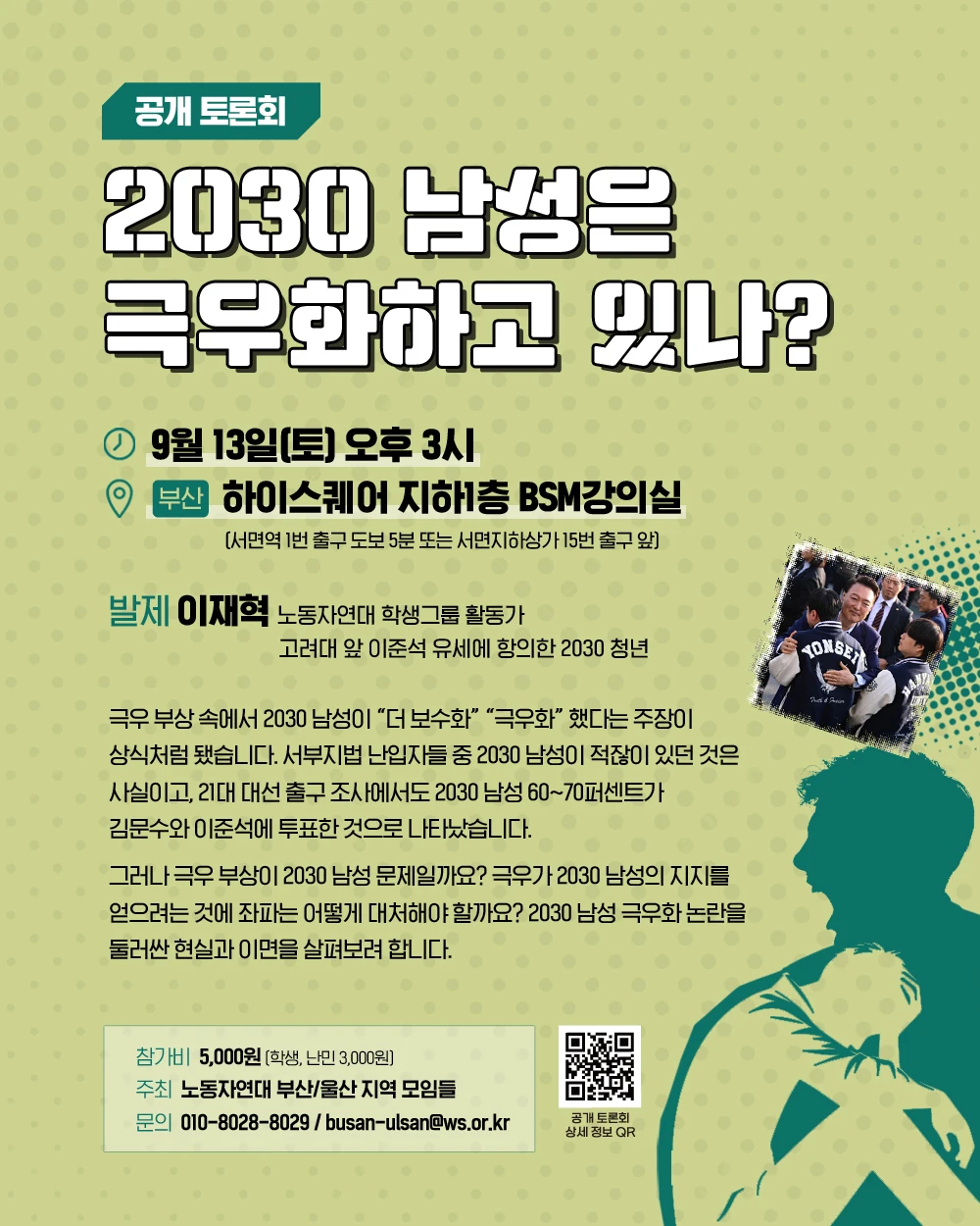 👉 [공개 토론회] 2030 남성은 극우화하고 있나? https://ws.or.kr/forum/37720 📌 일시: 2025년 9월 13일(토) 오후 3시 📌 발제자: 이재혁 (노동자연대 학생그룹 활동가, 고려대 앞 이준석 유세에 항의한 2030 청년) 📌 장소: 부산 하이스퀘어 지하1층 BSM강의실 (서면역 1번 출구 도보 5분 또는 서면지하상가 15번 출구 앞) 📌 참가비: 5000원 (학생, 난민 3000원) 💬 극우 부상 속에서 2030 남성이 “더 보수화” “극우화” 했다는 주장이 상식처럼 됐습니다. 서부지법 난입자들 중 2030 남성이 적잖이 있던 것은 사실이고, 21대 대선 출구 조사에서도 2030 남성 60~70퍼센트가 김문수와 이준석에 투표한 것으로 나타났습니다. 그러나 극우 부상이 2030 남성 문제일까요? 극우가 2030 남성의 지지를 얻으려는 것에 좌파는 어떻게 대처해야 할까요? 2030 남성 극우화 논란을 둘러싼 현실과 이면을 살펴보려 합니다. 🔺 주최: 노동자연대 부산/울산 지역 모임들 🔺 문의: 010-8028-8029 / busan-ulsan@ws.or.kr