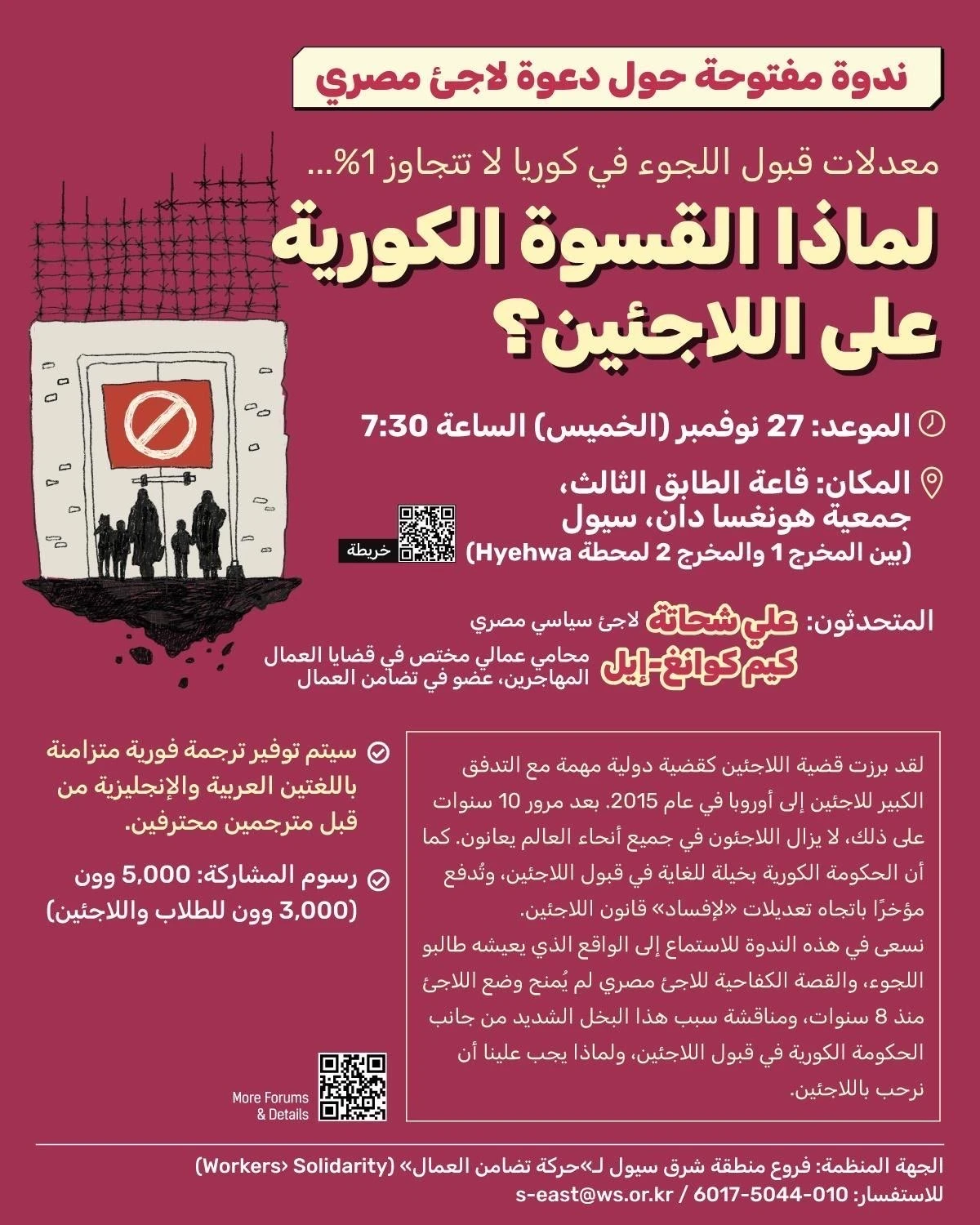 نسعى في هذه الندوة للاستماع إلى الواقع الذي يعيشه طالبو اللجوء، والقصة الكفاحية للاجئ مصري لم يُمنح وضع اللاجئ منذ 8 سنوات، ومناقشة سبب هذا البخل الشديد من جانب الحكومة الكورية في قبول اللاجئين، ولماذا يجب علينا أن نرحب باللاجئين.