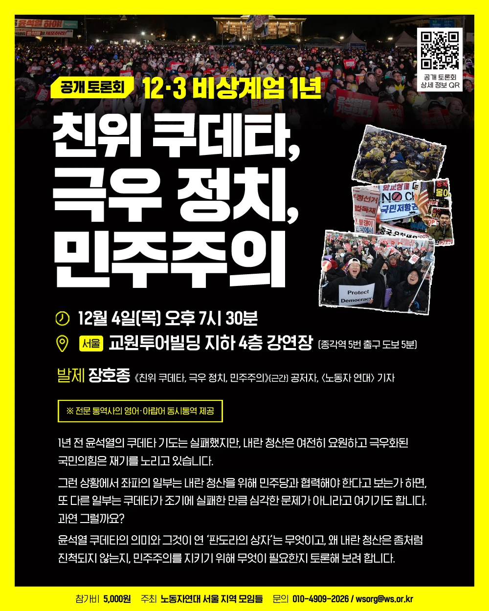 04 December(Thu) 7:30pm | Speaker: Jang Ho-jong (Co-author of the book Auto-Coup, Far-Right Politics, and Democracy, Reporter for Workers' Solidarity)