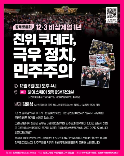 👉 [공개 토론회] 12·3 비상계엄 1년: 친위 쿠데타, 극우 정치, 민주주의 https://ws.or.kr/forum/38258 📌 일시: 12월 6일(토) 오후 4시 📌 발제자: 김문성 (《친위 쿠데타, 극우 정치, 민주주의》(근간) 공저자, 〈노동자 연대〉 기자) 📌 장소: 부산 하이스퀘어 5층 QSM강의실 (서면역 1번 출구 도보 5분 또는 서면지하상가 15번 출구 앞) 📌 참가비: 5000원 (학생, 난민 3000원) 💬 1년 전 윤석열의 쿠데타 기도는 실패했지만, 내란 청산은 여전히 요원하고 극우화된 국민의힘은 재기를 노리고 있습니다. 그런 상황에서 좌파의 일부는 내란 청산을 위해 민주당과 협력해야 한다고 보는가 하면, 또 다른 일부는 쿠데타가 조기에 실패한 만큼 심각한 문제가 아니라고 여기기도 합니다. 과연 그럴까요? 윤석열 쿠데타의 의미와 그것이 연 ‘판도라의 상자’는 무엇이고, 왜 내란 청산은 좀처럼 진척되지 않는지, 민주주의를 지키기 위해 무엇이 필요한지 토론해 보려 합니다. 🔺 주최: 노동자연대 부산/울산 지역 모임들 🔺 문의: 010-8028-8029 / busan-ulsan@ws.or.kr