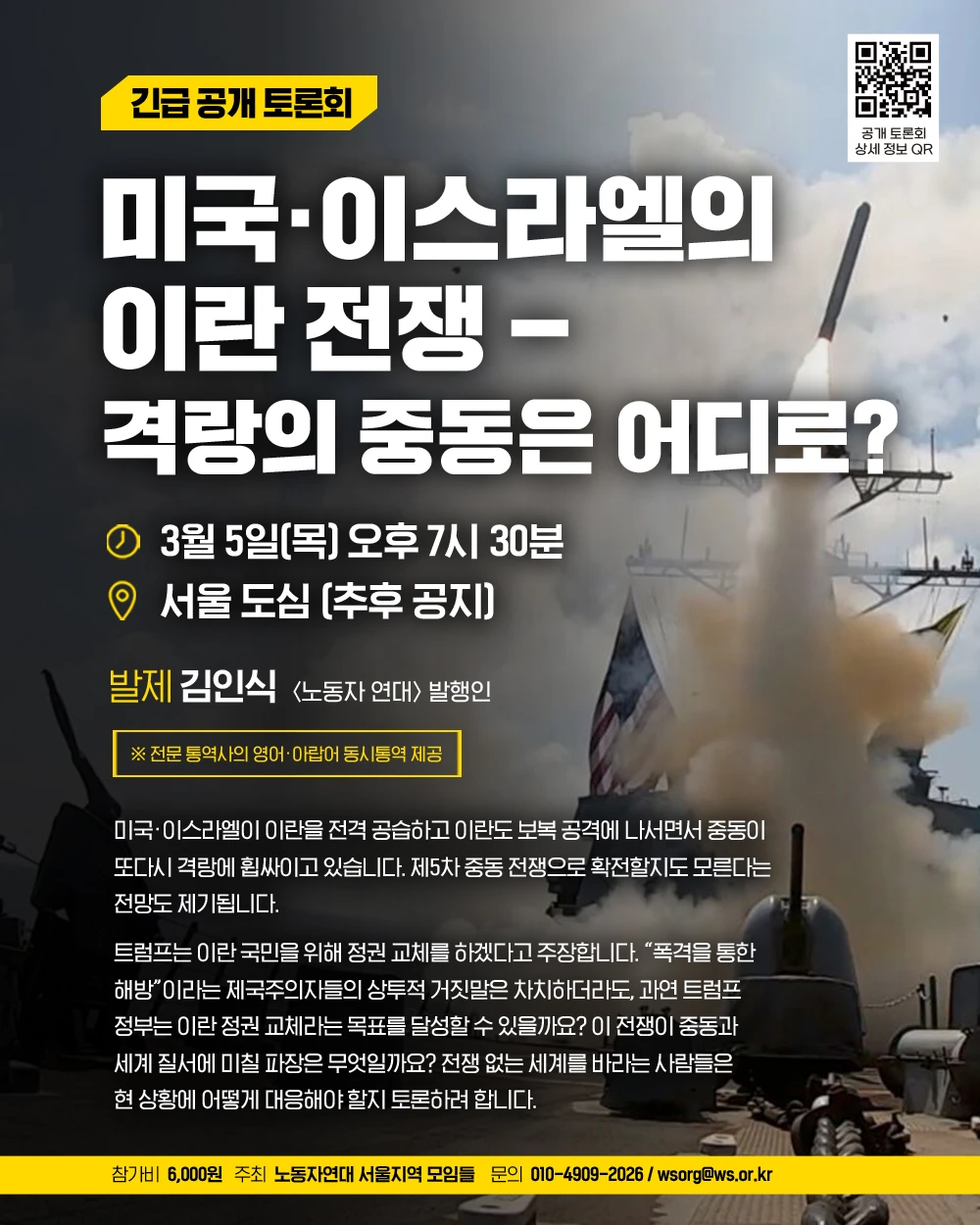 트럼프는 이란 국민을 위해 정권 교체를 하겠다고 주장합니다. “폭격을 통한 해방”이라는 제국주의자들의 상투적 거짓말은 차치하더라도, 과연 트럼프 정부는 이란 정권 교체라는 목표를 달성할 수 있을까요? 이 전쟁이 중동과 세계 질서에 미칠 파장은 무엇일까요? 전쟁 없는 세계를 바라는 사람들은 현 상황에 어떻게 대응해야 할지 토론하려 합니다.