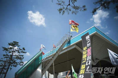 한국도로공사 서울영업소 앞에 거대한 텐트촌이 형성됐다. 십여 년을 일하고도 한순간에 일터에서 쫓겨난 톨게이트 노동자들이 일주일이 넘도록 대규모 농성 중인 곳이다. 구조물 위의 노동자 40여 명은 계단을 철조망으로 막아 스스로를 캐노피 지붕 위에 가뒀다. “자회사가 아닌 직접고용”을 요구하는 노동자들의 염원이 담긴 문구가 서울톨게이트 건물 안과 밖 곳곳에…