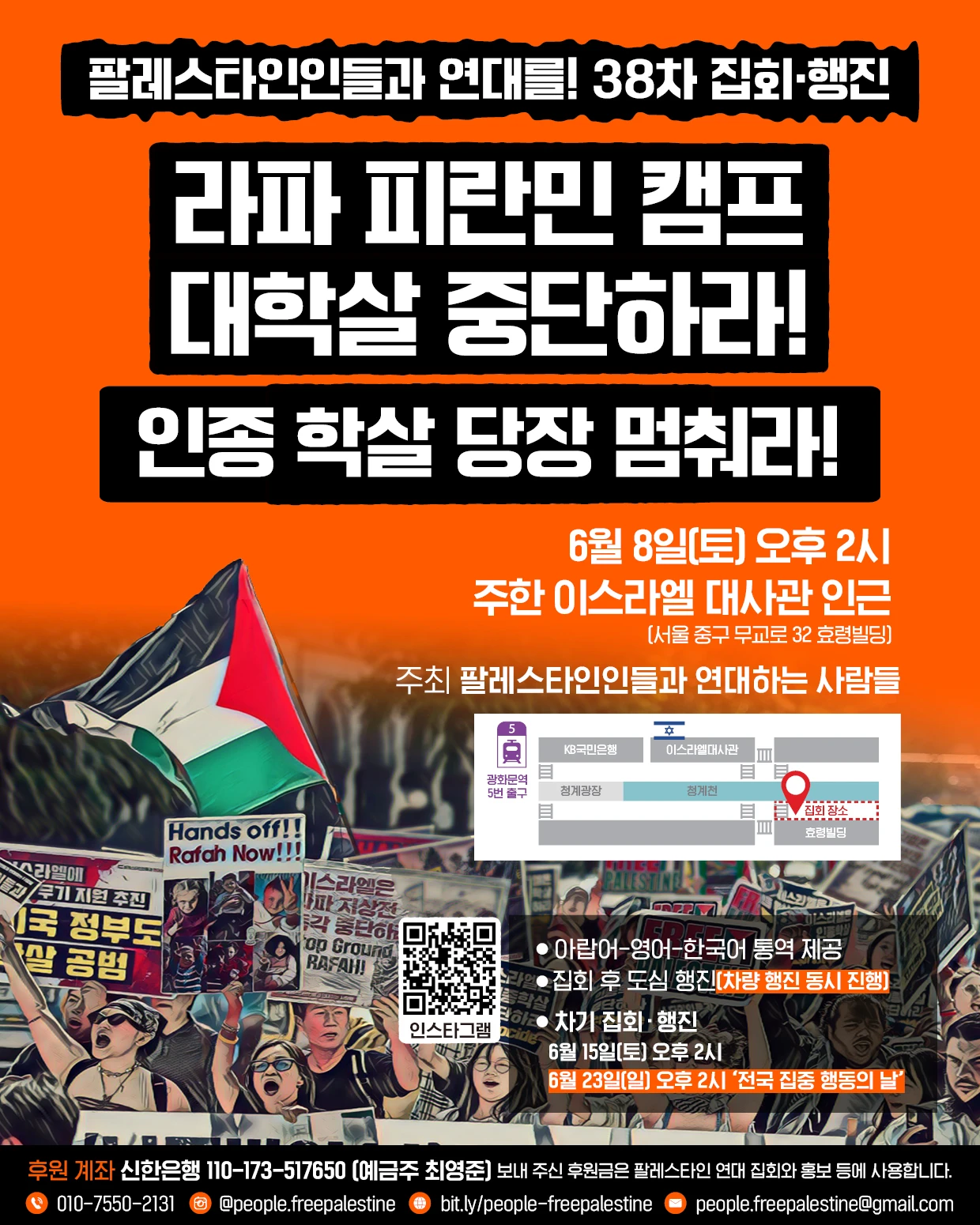 👉일시: 6월 8일(토) 오후 2시 👉장소: 주한 이스라엘 대사관 인근 (서울 중구 무교로 32 효령빌딩) 👉주최: 팔레스타인인들과 연대하는 사람들