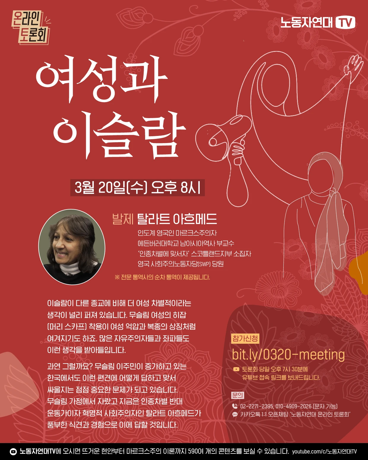 이슬람이 다른 종교에 비해 더 여성 차별적이라는 생각이 널리 퍼져 있습니다. 무슬림 여성의 히잡(머리 스카프) 착용이 여성 억압과 복종의 상징처럼 여겨지기도 하죠. 많은 자유주의자들과 좌파들도 이런 생각을 받아들입니다. 과연 그럴까요? 무슬림 이주민이 증가하고 있는 한국에서도 이런 편견에 어떻게 답하고 맞서 싸울지는 점점 중요한 문제가 되고 있습니다. 무슬림 가정에서 자랐고 지금은 인종차별 반대 운동가이자 혁명적 사회주의자인 탈라트 아흐메드가 풍부한 식견과 경험으로 이에 답할 것입니다.