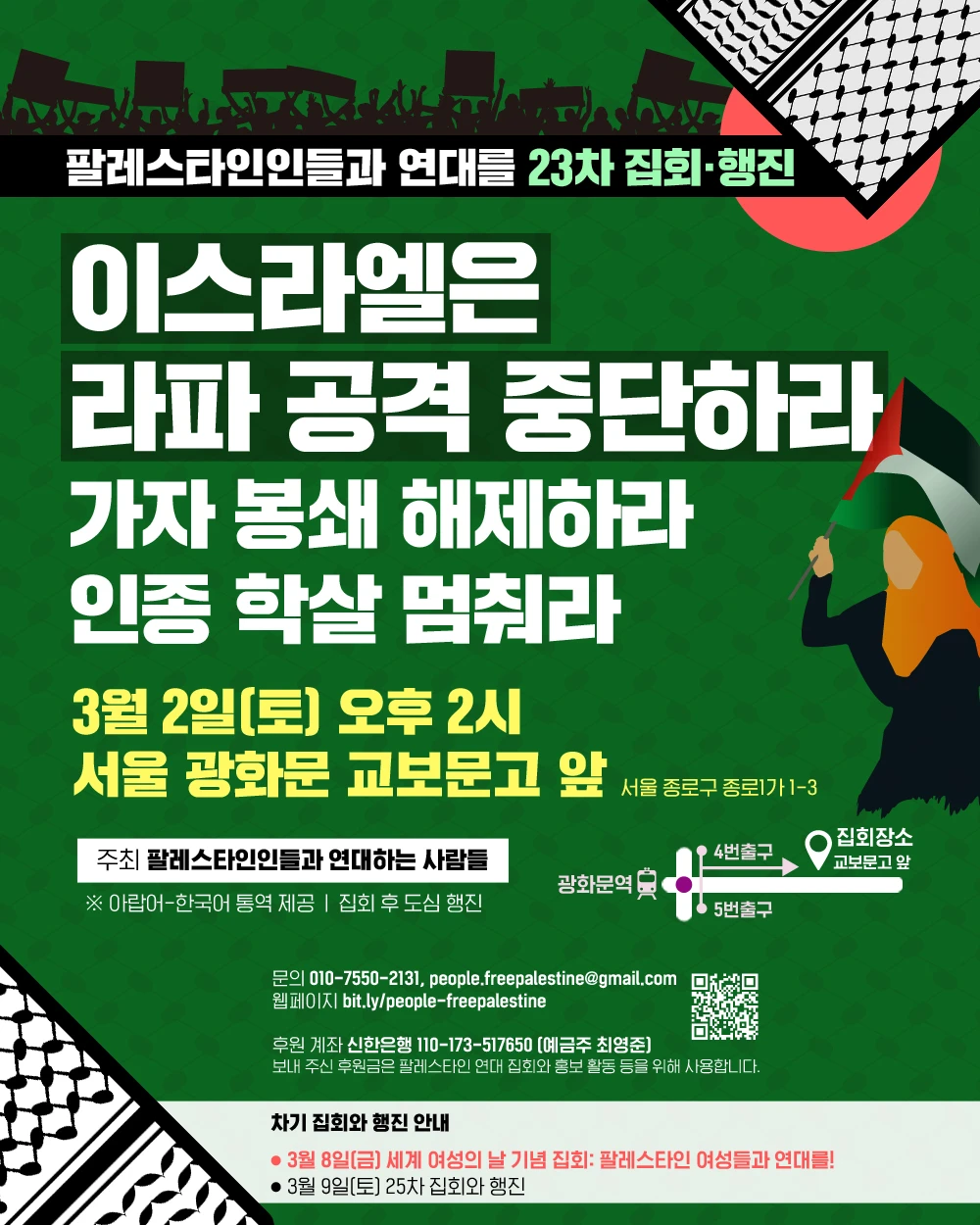 👉문의: 010-7550-2131 / people.freepalestine@gmail.com 웹페이지: bit.ly/people-freepalestine -------------- [차기 집회와 행진 안내] 📌 3월 8일(금) 세계 여성의 날 기념 집회 ‘팔레스타인 여성들과 연대를!’ 📌 3월 9일(토) 오후 2시 25차 집회와 행진 -------------- ○ 후원 계좌: 신한은행 110-173-517650 (예금주 최영준) 보내 주신 후원금은 팔레스타인 연대 집회와 홍보 등에 사용합니다.