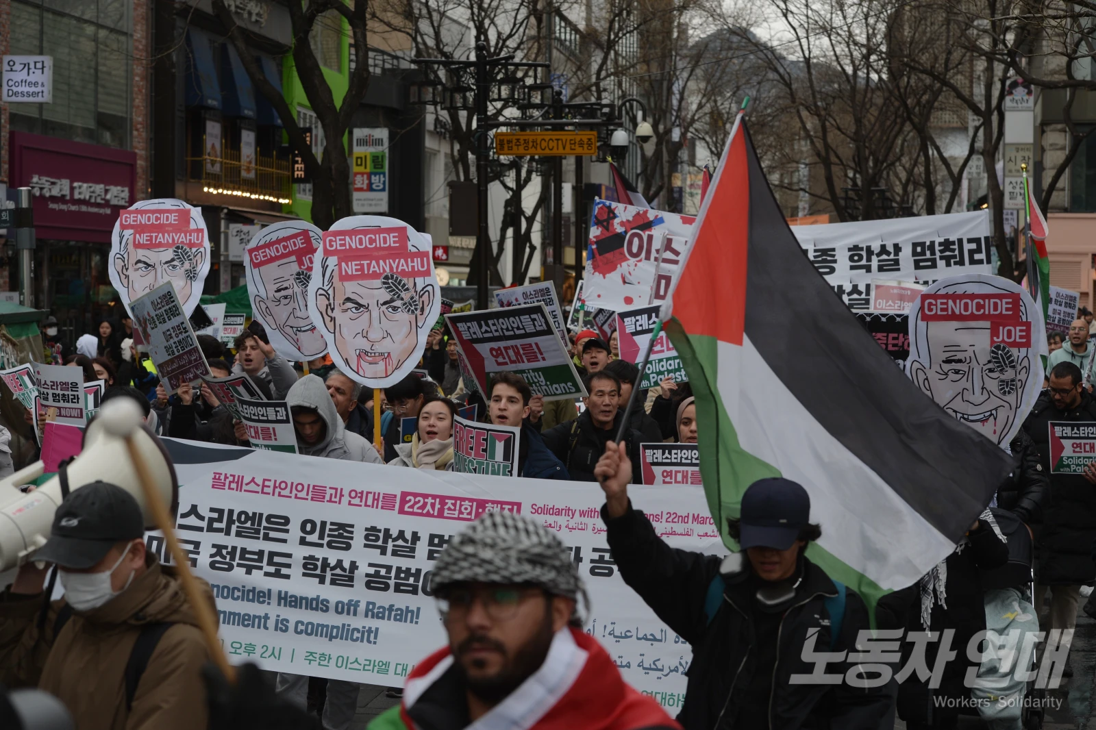 이스라엘은 라파 공격 중단하라! 가자 봉쇄 해제하라! 인종 학살 멈춰라! 팔레스타인인들과 연대를!