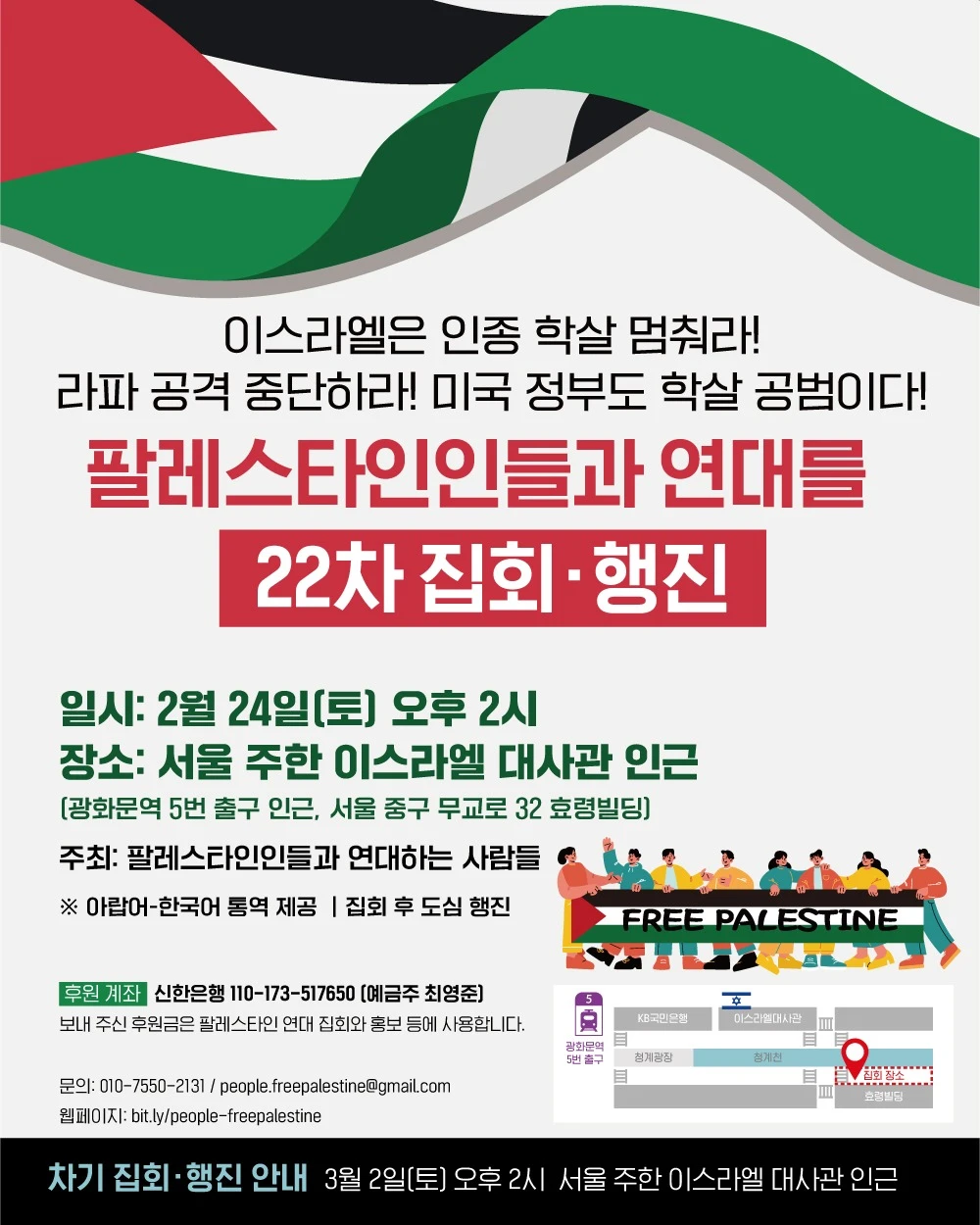 👉 일시: 2월 24일(토) 오후 2시 👉 장소: 서울 주한 이스라엘 대사관 인근 (광화문역 5번 출구 인근, 서울 중구 무교로 32 효령빌딩) 👉 주최: 팔레스타인인들과 연대하는 사람들