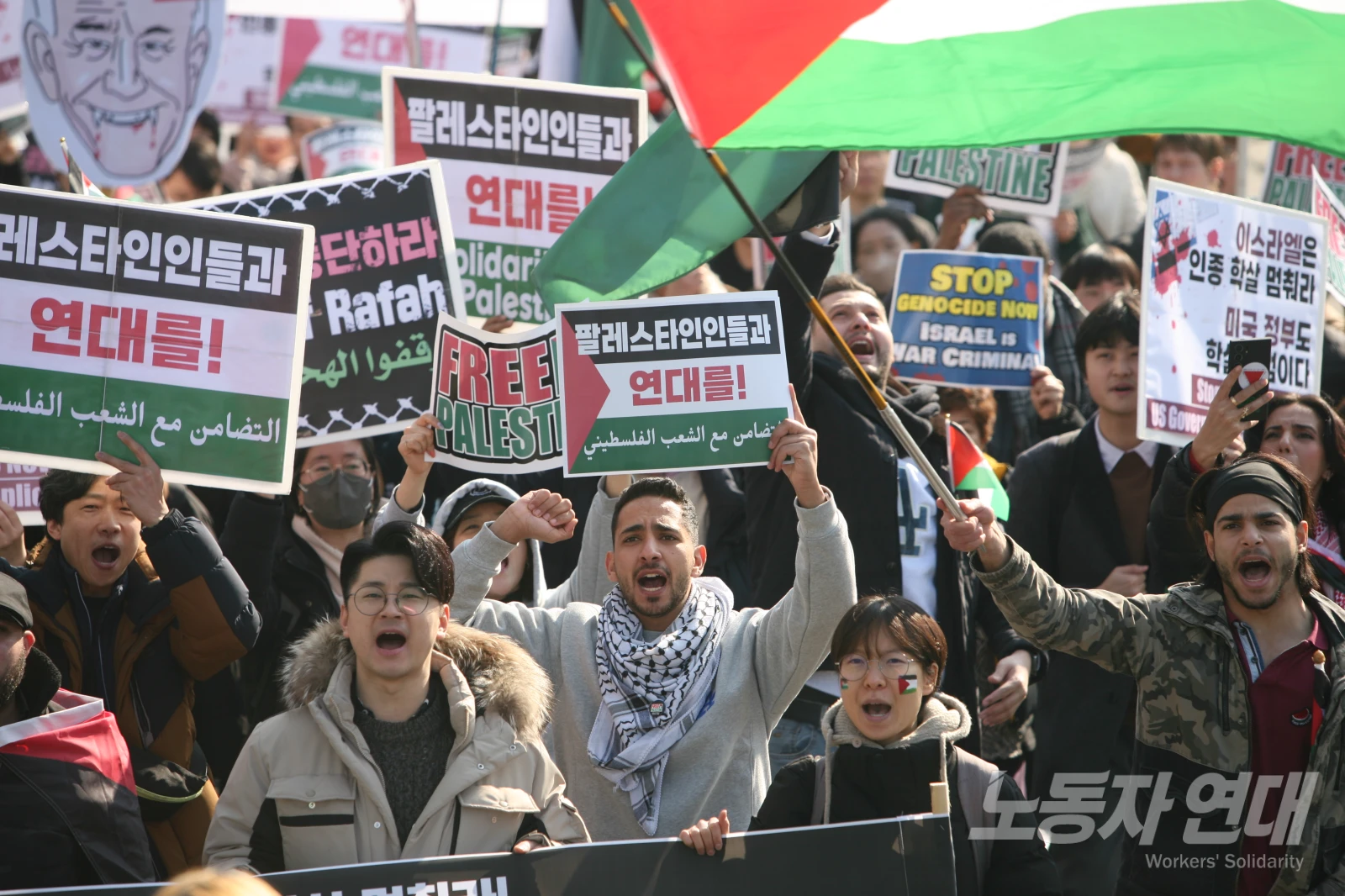 이스라엘이 팔레스타인인 난민 100만 명 이상이 내몰려 있는 가자지구 최남단 라파 지역을 공습하고 있습니다. 미국 등 서방 정부들은 국제사법재판소의 결정도 개무시하고 있는 이스라엘을 계속 지원하고 있죠. 현지의 팔레스타인인들은 전 세계를 향해 2월 17~18일 국제 행동의 날을 호소했습니다. 그에 응답해 전 세계 145곳이 넘는 도시에서 시위와 행진이 열리는 가운데, 2월 17일 한국 서울에서도 팔레스타인인들과 연대하는 국제 행동의 날 대행진이 열렸습니다. 대행진에 모인 내외국인 수백 명이 광화문, 인사동, 명동 등 서울 중심부를 누비며 이스라엘을 규탄하고 팔레스타인인들에게 연대를 전한 뜨거운 현장을 영상으로 만나 보세요.