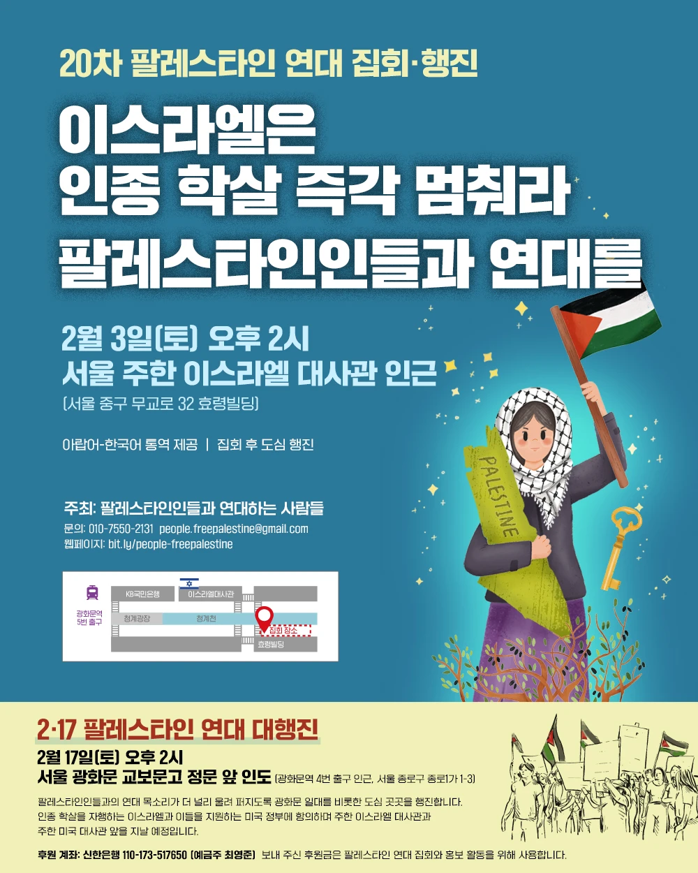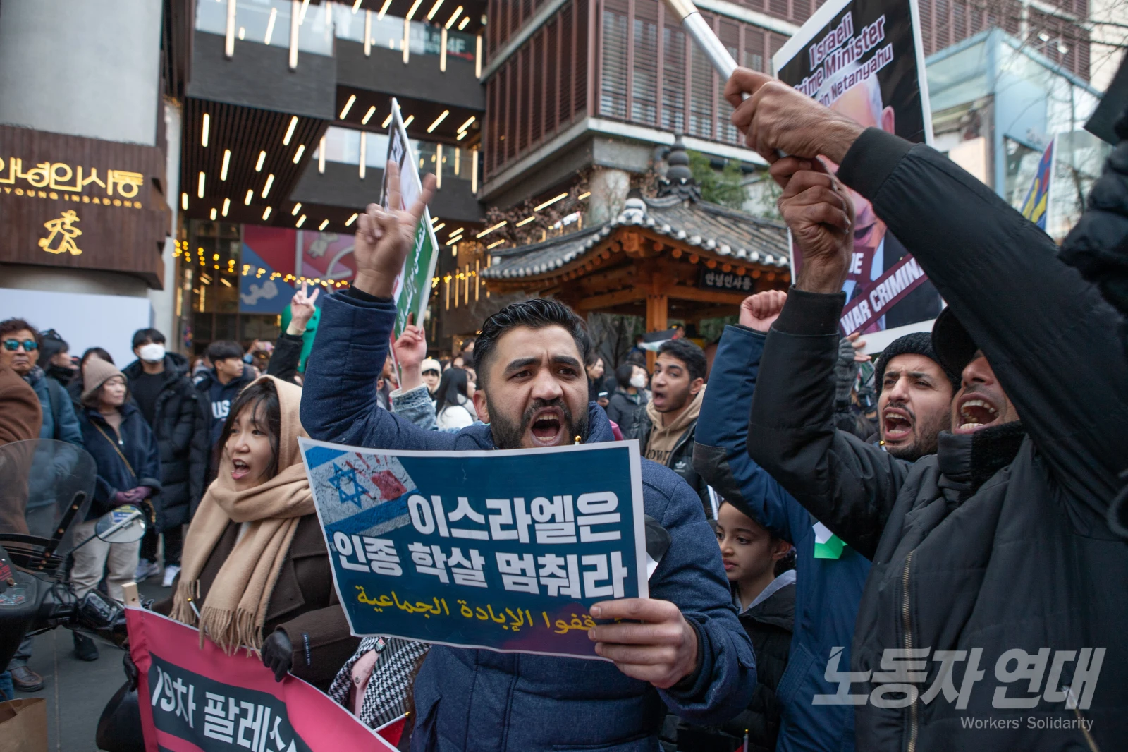 1월 27일 서울에서 19차 팔레스타인 연대 집회가 열렸습니다. 국제사법재판소가 이스라엘에 인종 학살 방지 명령을 내린 직후에 열린 만큼 집회는 자신감과 활기가 넘쳤습니다. 300여 명의 다국적 참가자들은 이스라엘의 인종 청소와 이를 후원하는 서방을 강력히 규탄하며 “팔레스타인 저항 정당하다!”, “팔레스타인에 승리를!” 등의 구호를 외쳤습니다. 참가자들의 힘찬 외침과 행진에 많은 시민들도 호응했습니다. 활기차게 진행된 팔레스타인 연대 집회를 영상으로 만나보세요.