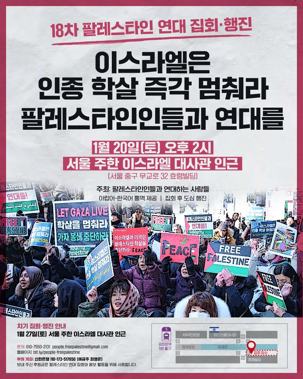 👉일시: 1월 20일(토) 오후 2시 👉장소: 서울 주한 이스라엘 대사관 인근(서울 중구 무교로 32 효령빌딩) 👉주최: 팔레스타인인들과 연대하는 사람들(bit.ly/people-freepalestine)