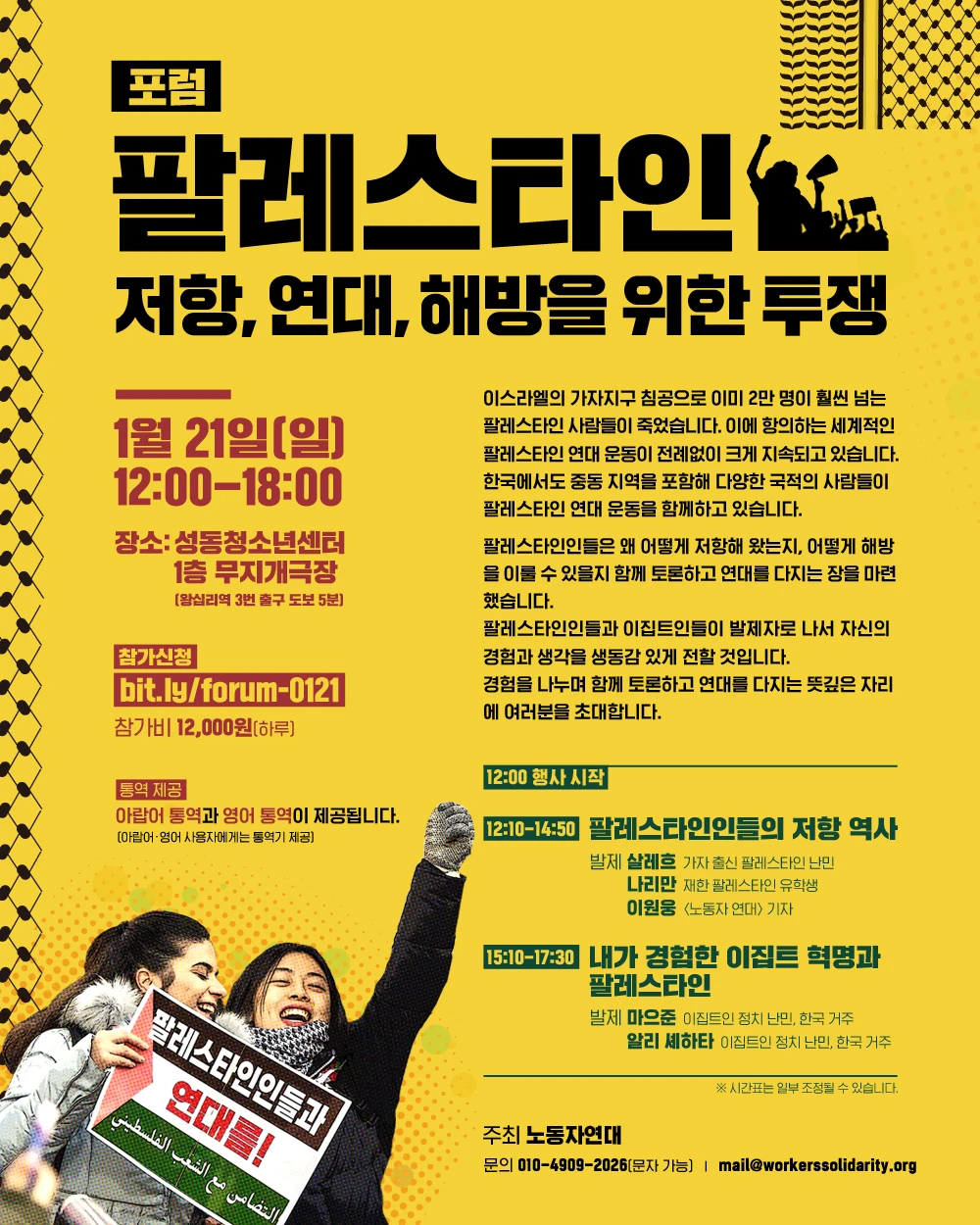 이스라엘의 가자지구 침공으로 이미 2만 명이 훨씬 넘는 팔레스타인 사람들이 죽었습니다. 이에 항의하는 세계적인 팔레스타인 연대 운동이 전례없이 크게 지속되고 있습니다. 한국에서도 중동 지역을 포함해 다양한 국적의 사람들이 팔레스타인 연대 운동을 함께하고 있습니다. 팔레스타인인들은 왜 어떻게 저항해 왔는지, 어떻게 해방을 이룰 수 있을지 함께 토론하고 연대를 다지는 장을 마련했습니다. 팔레스타인인들과 이집트인들이 발제자로 나서 자신의 경험과 생각을 생동감 있게 전할 것입니다. 경험을 나누며 함께 토론하고 연대를 다지는 뜻깊은 자리에 여러분을 초대합니다.