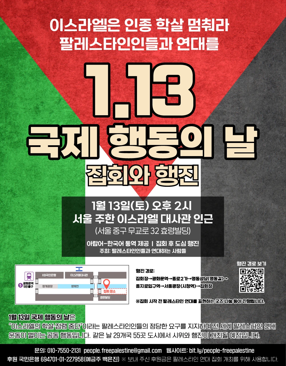 ’1월 13일 국제 행동의 날’은 “이스라엘의 학살과 점령 중단”이라는 팔레스타인인들의 정당한 요구를 지지하며 전 세계 팔레스타인 연대 운동이 벌이는 공동 행동입니다. 같은 날 29개국 55곳 도시에서 시위와 행진이 개최될 예정입니다.