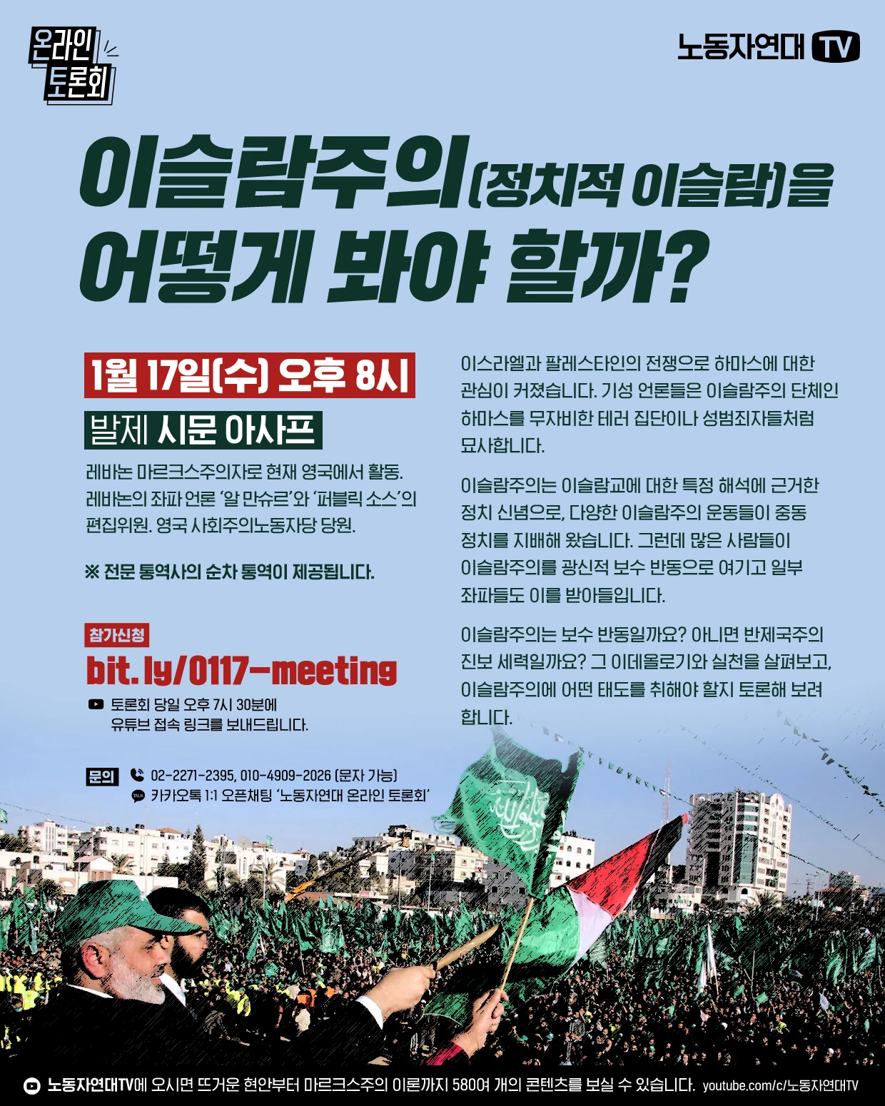 이스라엘과 팔레스타인의 전쟁으로 하마스에 대한 관심이 커졌습니다. 기성 언론들은 이슬람주의 단체인 하마스를 무자비한 테러 집단이나 성범죄자들처럼 묘사합니다. 이슬람주의는 이슬람교에 대한 특정 해석에 근거한 정치 신념으로, 다양한 이슬람주의 운동들이 중동 정치를 지배해 왔습니다. 그런데 많은 사람들이 이슬람주의를 광신적 보수 반동으로 여기고 일부 좌파들도 이를 받아들입니다. 이슬람주의는 보수 반동일까요? 아니면 반제국주의 진보 세력일까요? 그 이데올로기와 실천을 살펴보고, 이슬람주의에 어떤 태도를 취해야 할지 토론해 보려 합니다.