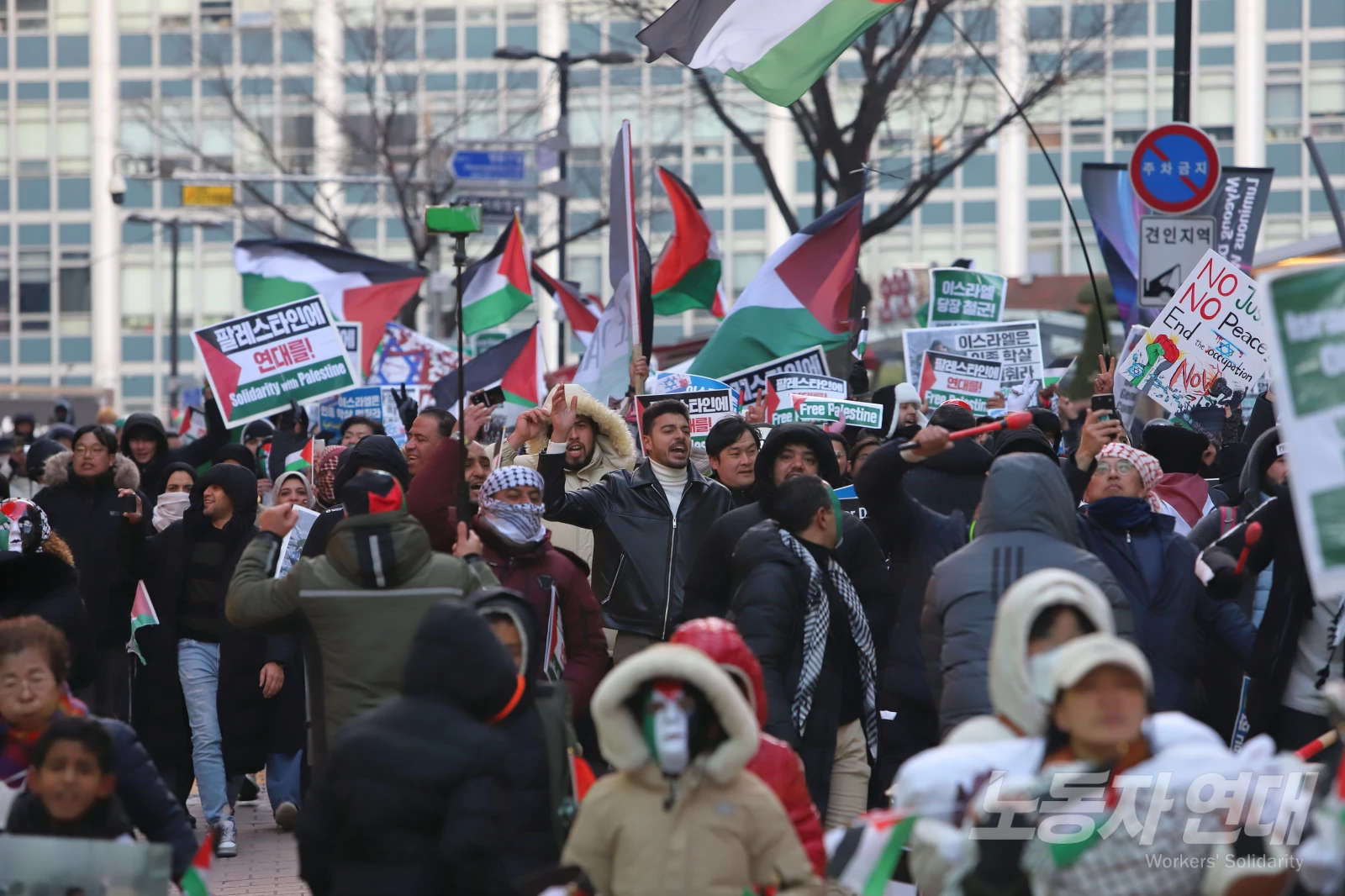 이스라엘의 인종 학살이 지속돼 그 참상이 날로 악화되지만, 이스라엘도 현지 저항과 국제 연대 운동에 부딪혀 여러 난관에 봉착했습니다. 그런 가운데 12월 16일 서울에서 팔레스타인 연대 집중 행동의 날 집회가 열렸습니다. 매서운 한파를 뚫고 팔레스타인인 등 내외국인 500여 명이 모여 이스라엘의 학살과 미국 정부의 전쟁 지원을 규탄했습니다. 팔레스타인인들은 자신들의 저항이 정당하다고 강조했습니다. “끈질기게 싸웁시다. 반드시 팔레스타인은 해방될 것입니다!” 참가자들은 매우 활기차게 행진했습니다. 서울 명동 거리에 행진 대열의 함성이 울려 퍼지자 많은 시민들이 뜨거운 지지를 보냈습니다. 울림이 가득했던 연대의 현장을 영상으로 만나 보세요.