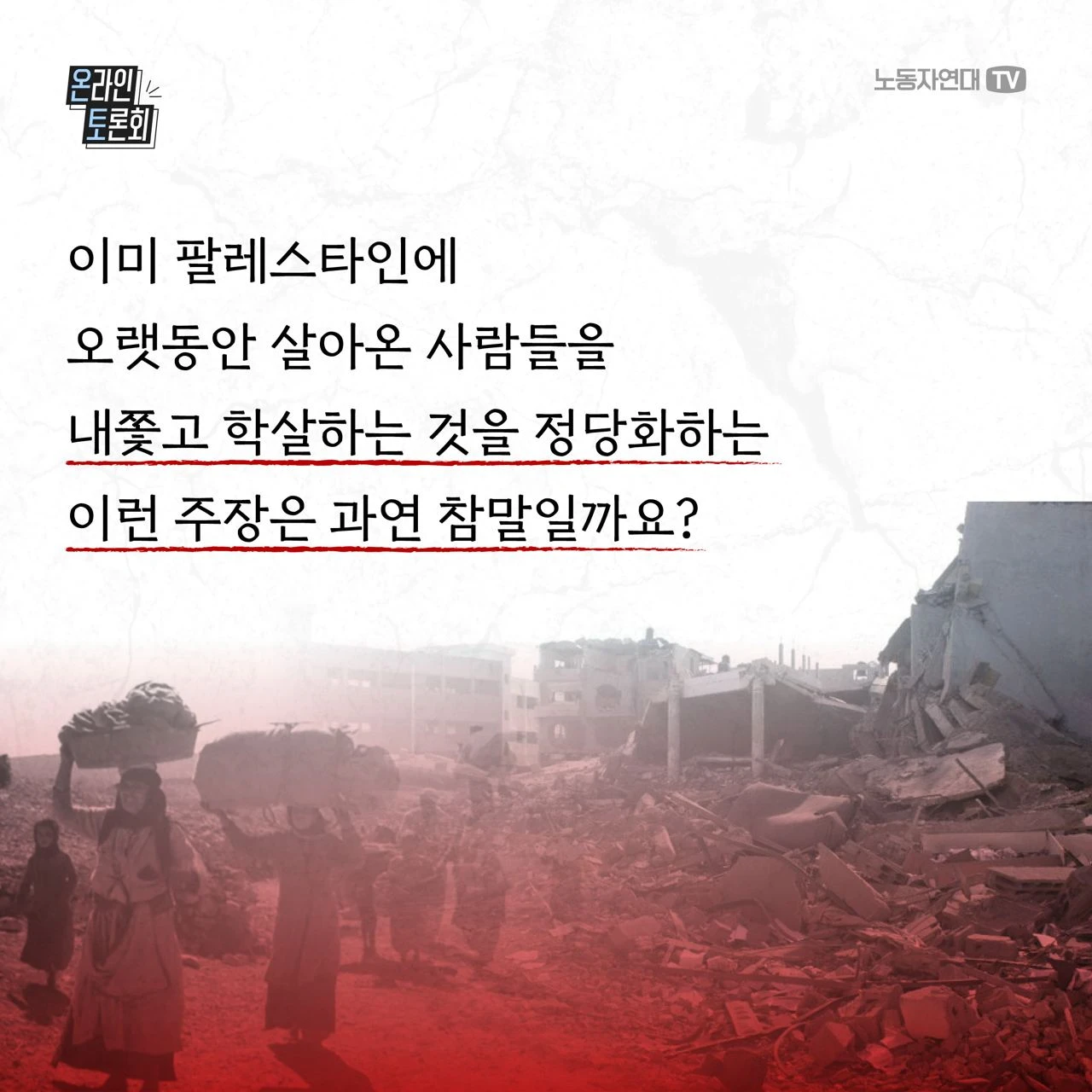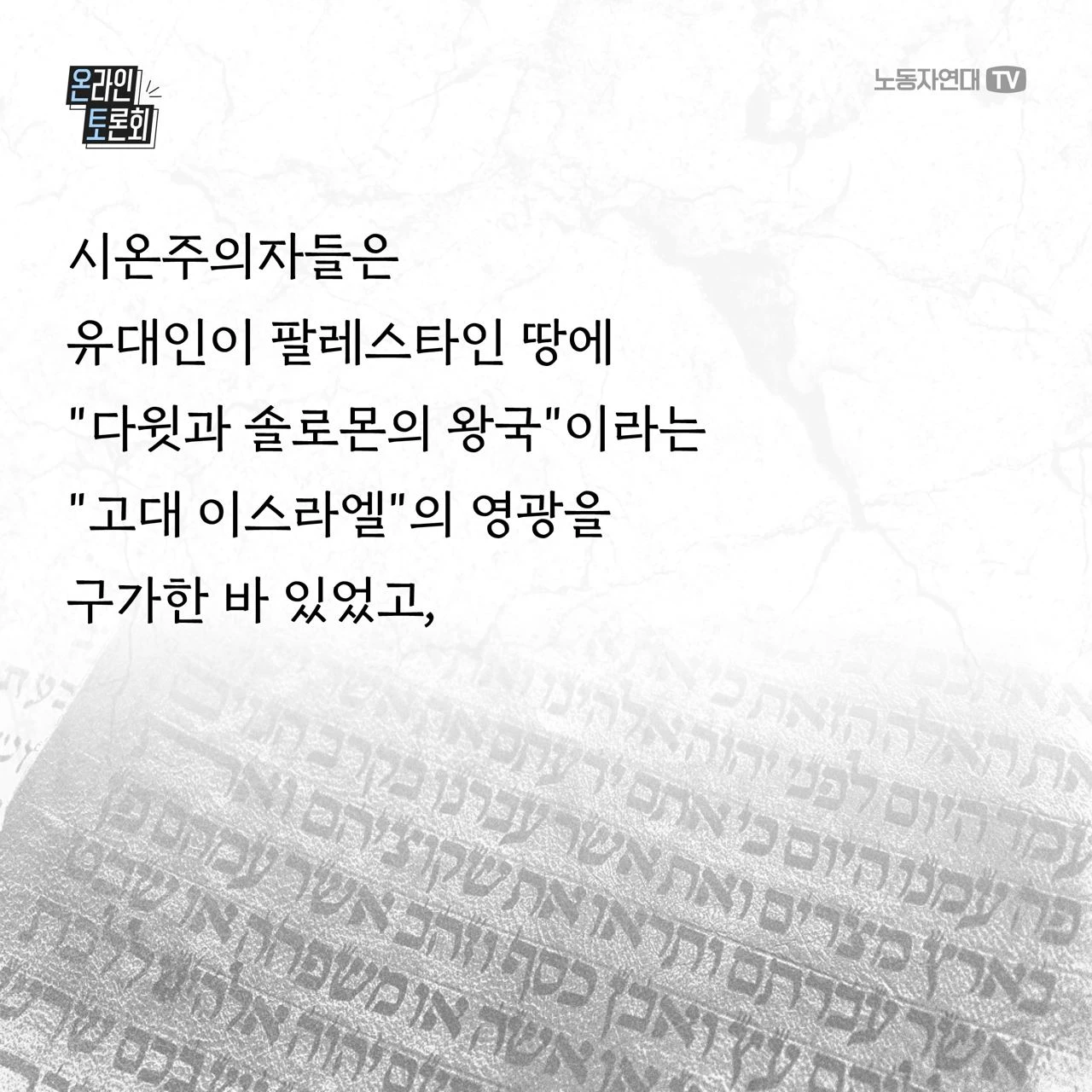 이스라엘 국가의 공식 이데올로기인 시온주의는 서기 70년에 로마제국에 의해 팔레스타인에서 쫓겨났던 유대인이 거의 1900년 만에 돌아와서 유대인 국민 국가를 수립할 권리가 있었다고 주장합니다. 시온주의자들은 유대인이 팔레스타인 땅에 “다윗과 솔로몬의 왕국”이라는 “고대 이스라엘”의 영광을 구가한 바 있었고, 오늘날 이스라엘이 바로 이 영광을 재현하고 있다고 주장합니다. 이미 팔레스타인에 오랫동안 살아온 사람들을 내쫓고 학살하는 것을 정당화하는 이런 주장은 과연 참말일까요?