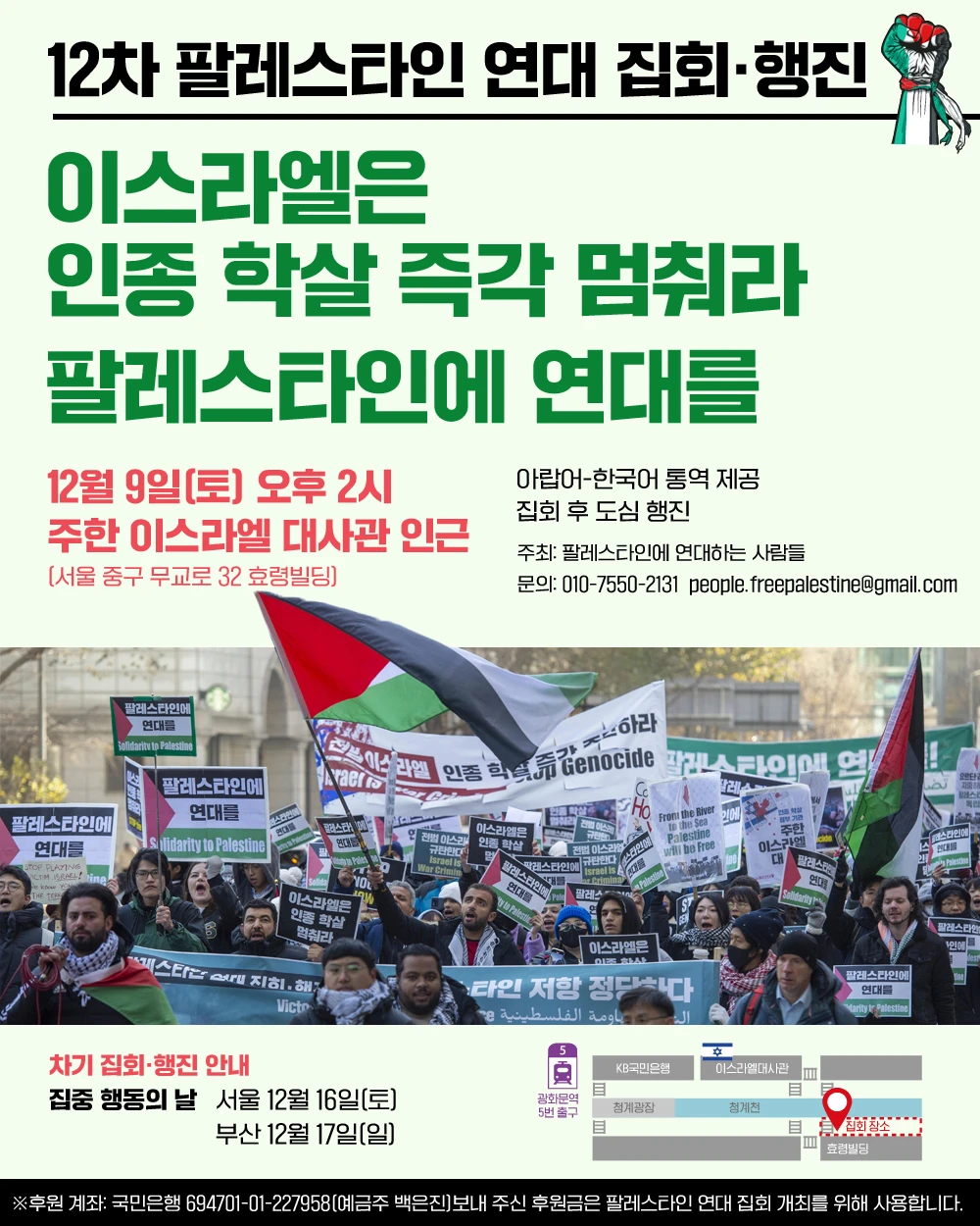 👉일시: 12월 9일(토) 오후 2시 👉장소: 주한 이스라엘대사관 인근(서울 중구 무교로 32 효령빌딩) ※ 집회 후 도심 행진 👉주최: 팔레스타인에 연대하는 사람들