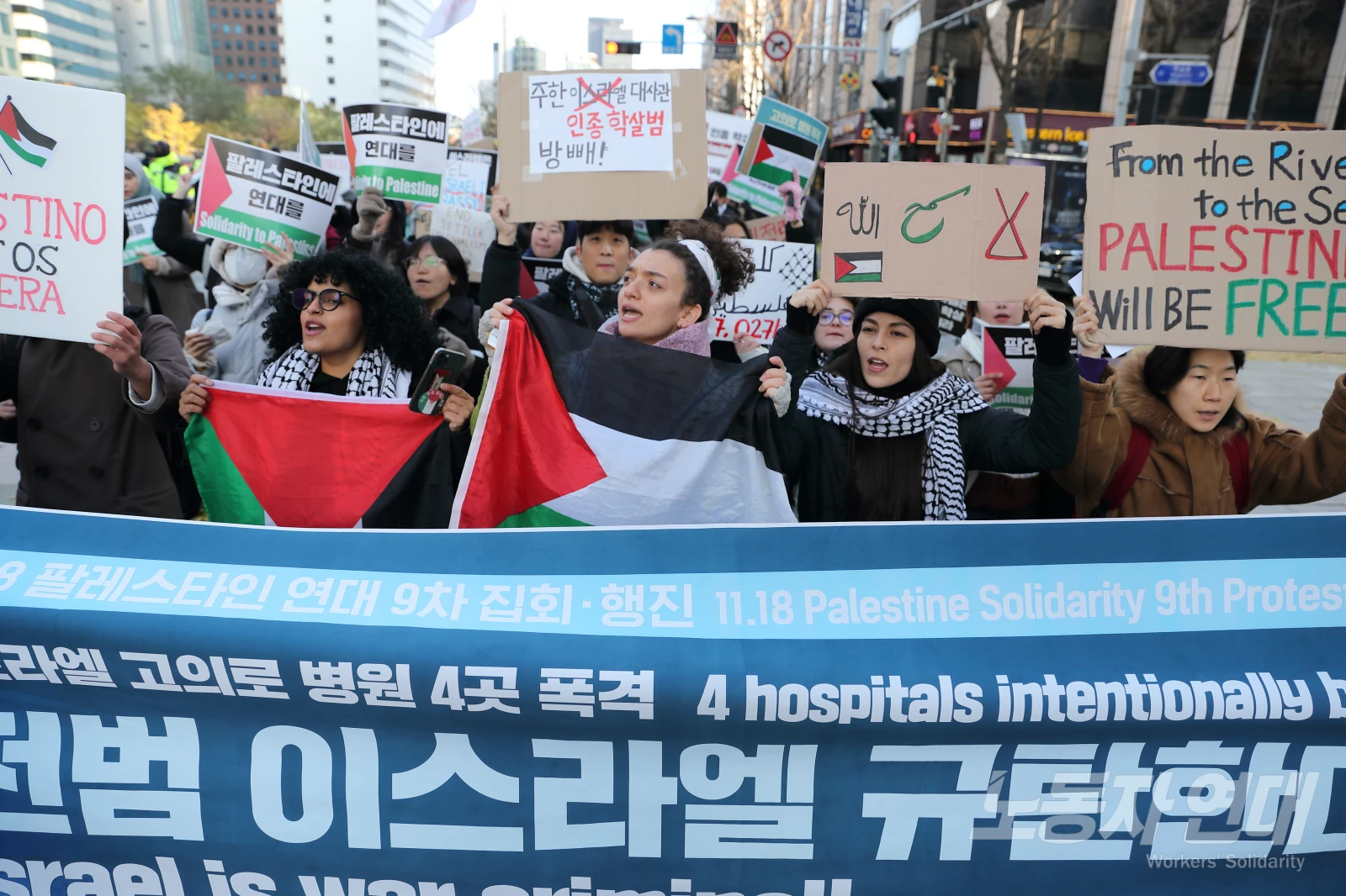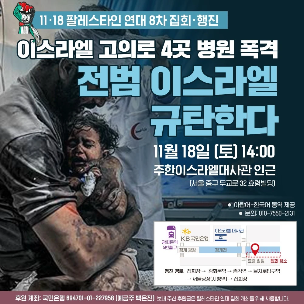 👉 11월 18일 9차 팔레스타인 연대 집회·행진: 의도적으로 가자 병원 공격한 이스라엘을 규탄하다