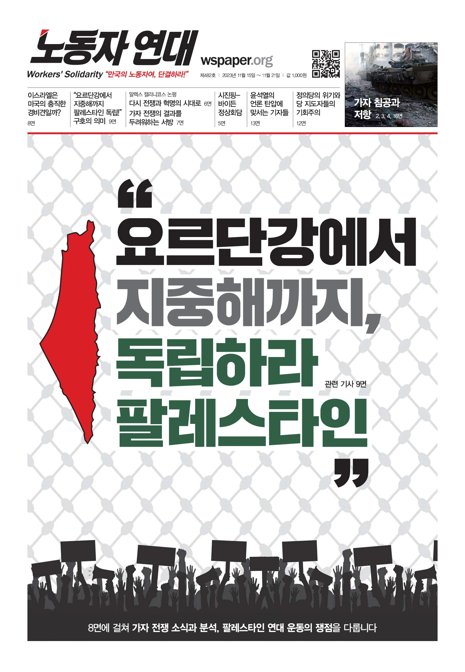 이스라엘군이 가자시티를 봉쇄하고 시가전을 벌이는 가운데, 11월 10일 서울 이태원에서 학살자 이스라엘과 이를 돕는 미국을 규탄하는 집회와 행진이 열렸습니다. 집회 참가자들은 영웅적 저항을 이어가고 있는 팔레스타인인들에게 연대의 목소리를 보냈습니다. 집회 후에는 주한 이집트 대사관 방향으로 행진해 ”라파 국경을 개방하라!“고 외쳤습니다. 라파는 이집트와 가자 지구를 연결하는 유일한 통행로입니다. 구호 물품이 들어가고 더 많은 희생을 막을 수 있도록, 라파 국경을 즉각 영구적으로 개방하라고 이집트 정부에 요구한 것입니다. 팔레스타인에 연대를! 팔레스타인에 승리를! 뜨거운 현장을 영상으로 만나 보세요.