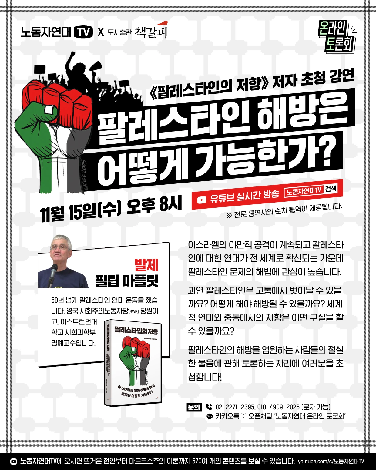 [노동자연대TV × 도서출판 책갈피 온라인 토론회] 《팔레스타인의 저항》 저자 초청 강연 팔레스타인 해방은 어떻게 가능한가? – 일시: 11월 15일(수) 오후 8시 – 발제: 필립 마플릿 50년 넘게 팔레스타인 연대 운동을 했습니다. 영국 사회주의노동자당(SWP) 당원이고, 이스트런던대학교 사회과학부 명예교수입니다. ※ 전문 통역사의 순차 통역이 제공됩니다.