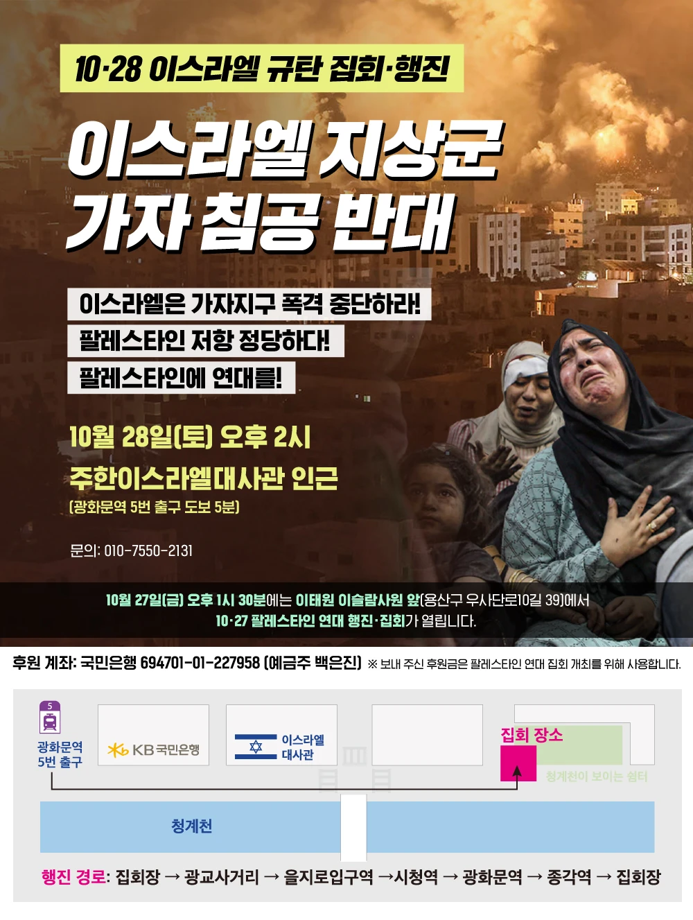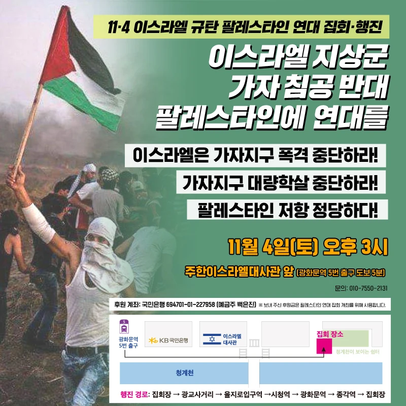 👉일시: 11월 4일(토) 오후 3시 👉장소: 주한이스라엘대사관 앞 (SK서린빌딩 남측 청계천 도로. 광화문역 5번 출구 도보 5분) 👉문의: 010-7550-2131 ------------------ ○ 후원 계좌: 국민은행 694701-01-227958 (예금주 백은진) 보내주신 후원금은 팔레스타인 연대 집회 개최를 위해 사용합니다.