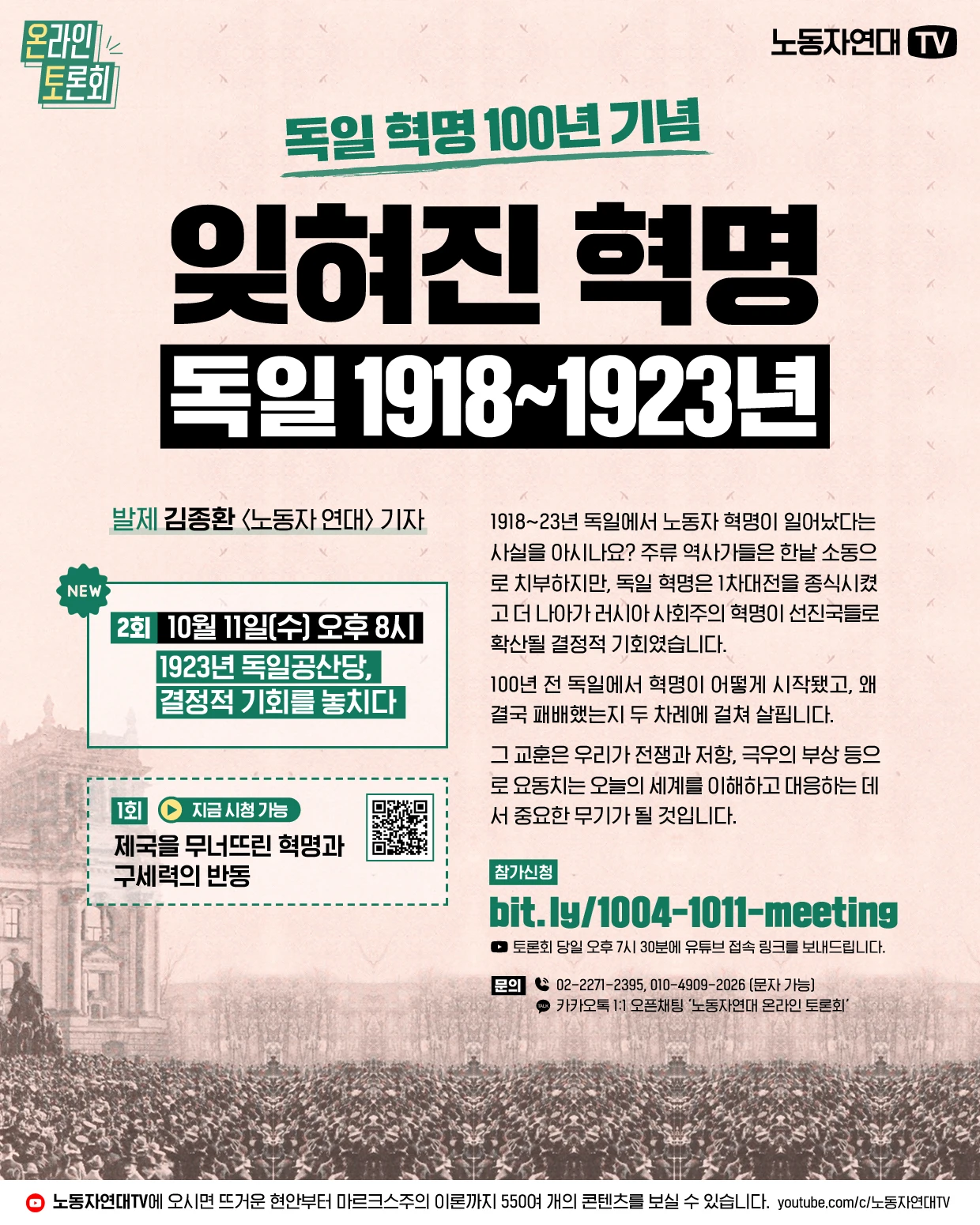 1918~23년 독일에서 노동자 혁명이 일어났다는 사실을 아시나요? 주류 역사가들은 한낱 소동으로 치부하지만, 독일 혁명은 1차대전을 종식시켰고 더 나아가 러시아 사회주의 혁명이 선진국들로 확산될 결정적 기회였습니다. 100년 전 독일에서 혁명이 어떻게 시작됐고, 왜 결국 패배했는지 두 차례에 걸쳐 살핍니다. 그 교훈은 우리가 전쟁과 저항, 극우의 부상 등으로 요동치는 오늘의 세계를 이해하고 대응하는 데서 중요한 무기가 될 것입니다.