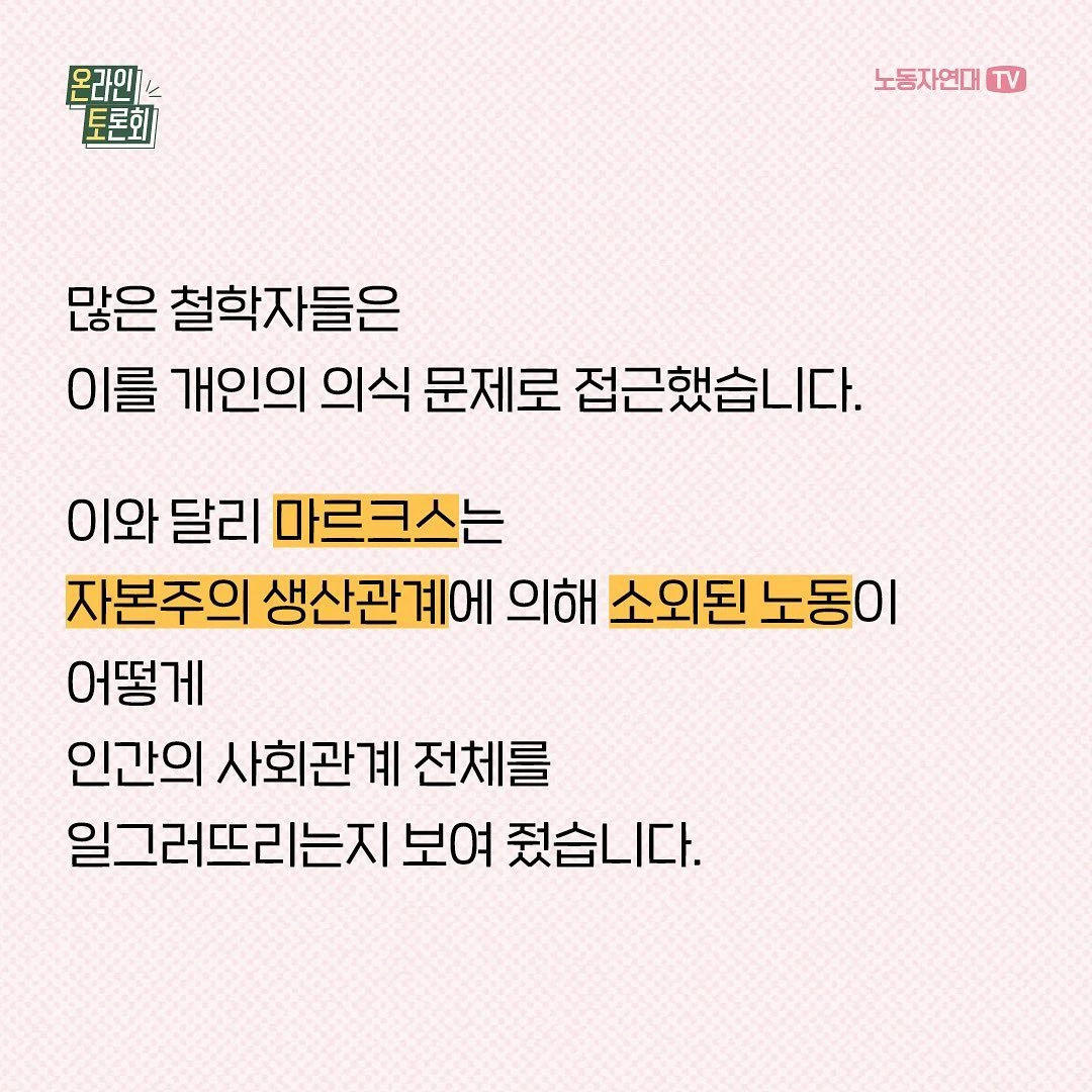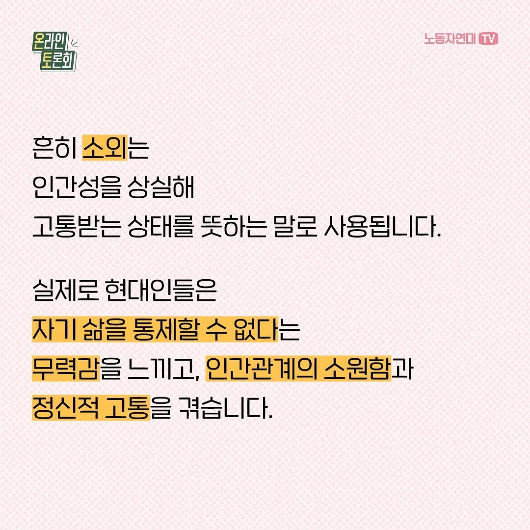 흔히 소외는 인간성을 상실해 고통받는 상태를 뜻하는 말로 사용됩니다. 실제로 현대인들은 자기 삶을 통제할 수 없다는 무력감을 느끼고, 인간관계의 소원함과 정신적 고통을 겪습니다. 많은 철학자들은 이를 개인의 의식 문제로 접근했습니다. 이와 달리 마르크스는 어떻게 자본주의 생산관계에 의해 소외된 노동이 인간의 사회관계 전체를 일그러뜨리는지 보여 줬습니다. 이런 접근법은 소외를 극복할 대안 때문에도 중요한데요. 자세한 내용을 이 영상에서 확인해 보세요.