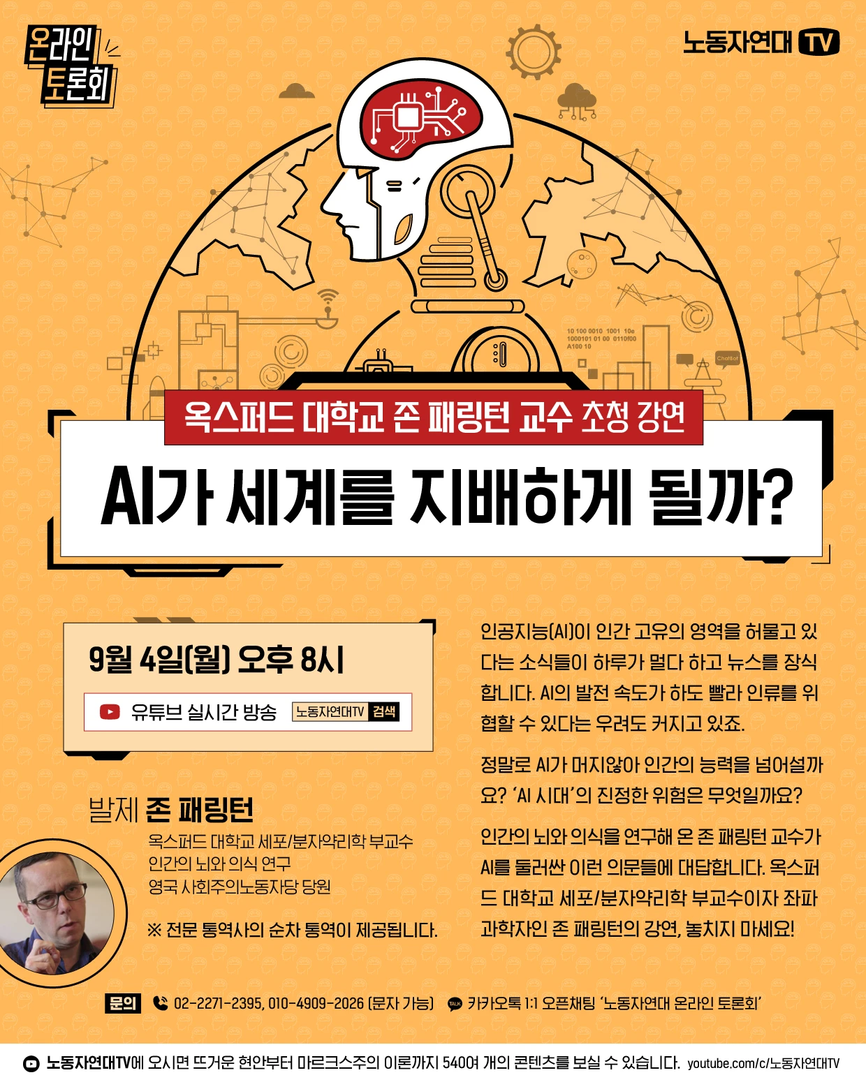 인공지능(AI)이 인간 고유의 영역을 허물고 있다는 소식들이 하루가 멀다 하고 뉴스를 장식합니다. AI의 발전 속도가 하도 빨라 인류를 위협할 수 있다는 우려도 커지고 있죠. 정말로 AI가 머지않아 인간의 능력을 넘어설까요? ‘AI 시대’의 진정한 위험은 무엇일까요? 인간의 뇌와 의식을 연구해 온 존 패링턴 교수가 AI를 둘러싼 이런 의문들에 대답합니다. 옥스퍼드 대학교 세포/분자약리학 부교수이자 좌파 과학자인 존 패링턴의 강연, 놓치지 마세요!