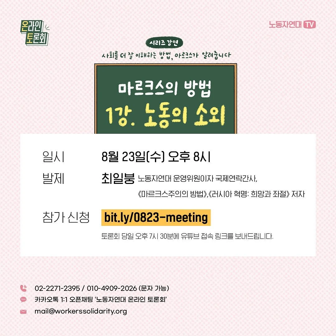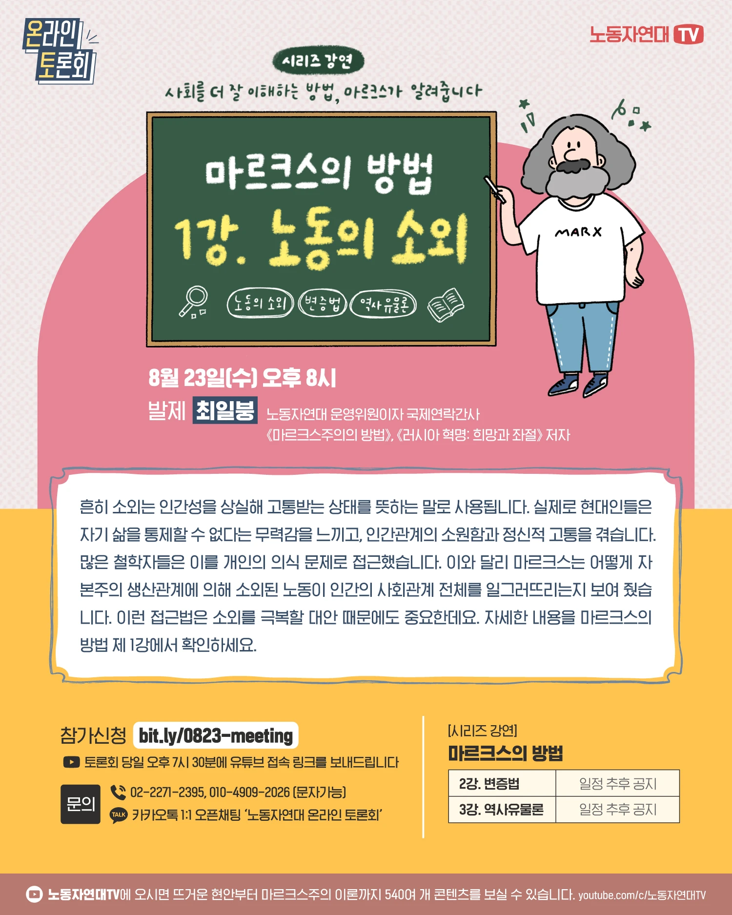 [노동자연대 온라인 토론회 시리즈 강연] 사회를 더 잘 이해하는 방법, 마르크스가 알려줍니다 - 마르크스의 방법 [1강] 노동의 소외 - 일시: 8월 23일(수) 오후 8시 - 발제: 최일붕 (노동자연대 운영위원이자 국제연락간사, 《마르크스주의의 방법》, 《러시아 혁명: 희망과 좌절》 저자)