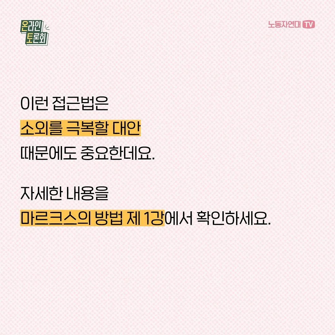 흔히 소외는 인간성을 상실해 고통받는 상태를 뜻하는 말로 사용됩니다. 실제로 현대인들은 자기 삶을 통제할 수 없다는 무력감을 느끼고, 인간관계의 소원함과 정신적 고통을 겪습니다. 많은 철학자들은 이를 개인의 의식 문제로 접근했습니다. 이와 달리 마르크스는 어떻게 자본주의 생산관계에 의해 소외된 노동이 인간의 사회관계 전체를 일그러뜨리는지 보여 줬습니다. 이런 접근법은 소외를 극복할 대안 때문에도 중요한데요. 자세한 내용을 마르크스의 방법 제 1강에서 확인하세요.