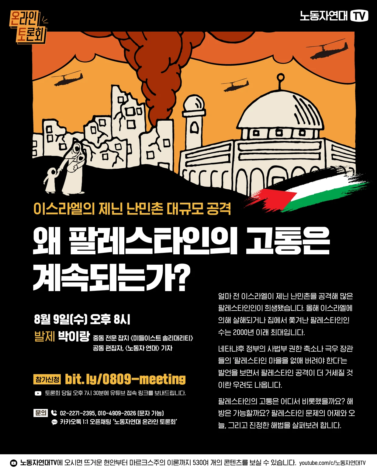 얼마 전 이스라엘이 제닌 난민촌을 공격해 많은 팔레스타인인이 희생됐습니다. 올해 이스라엘에 의해 살해되거나 집에서 쫓겨난 팔레스타인인 수는 2000년 이래 최대입니다. 네타냐후 정부의 사법부 권한 축소나 극우 장관들의 ‘팔레스타인 마을을 없애 버려야 한다’는 발언을 보면서 팔레스타인 공격이 더 거세질 것이란 우려도 나옵니다. 팔레스타인의 고통은 어디서 비롯했을까요? 해방은 가능할까요? 팔레스타인 문제의 어제와 오늘, 그리고 진정한 해법을 살펴보려 합니다.