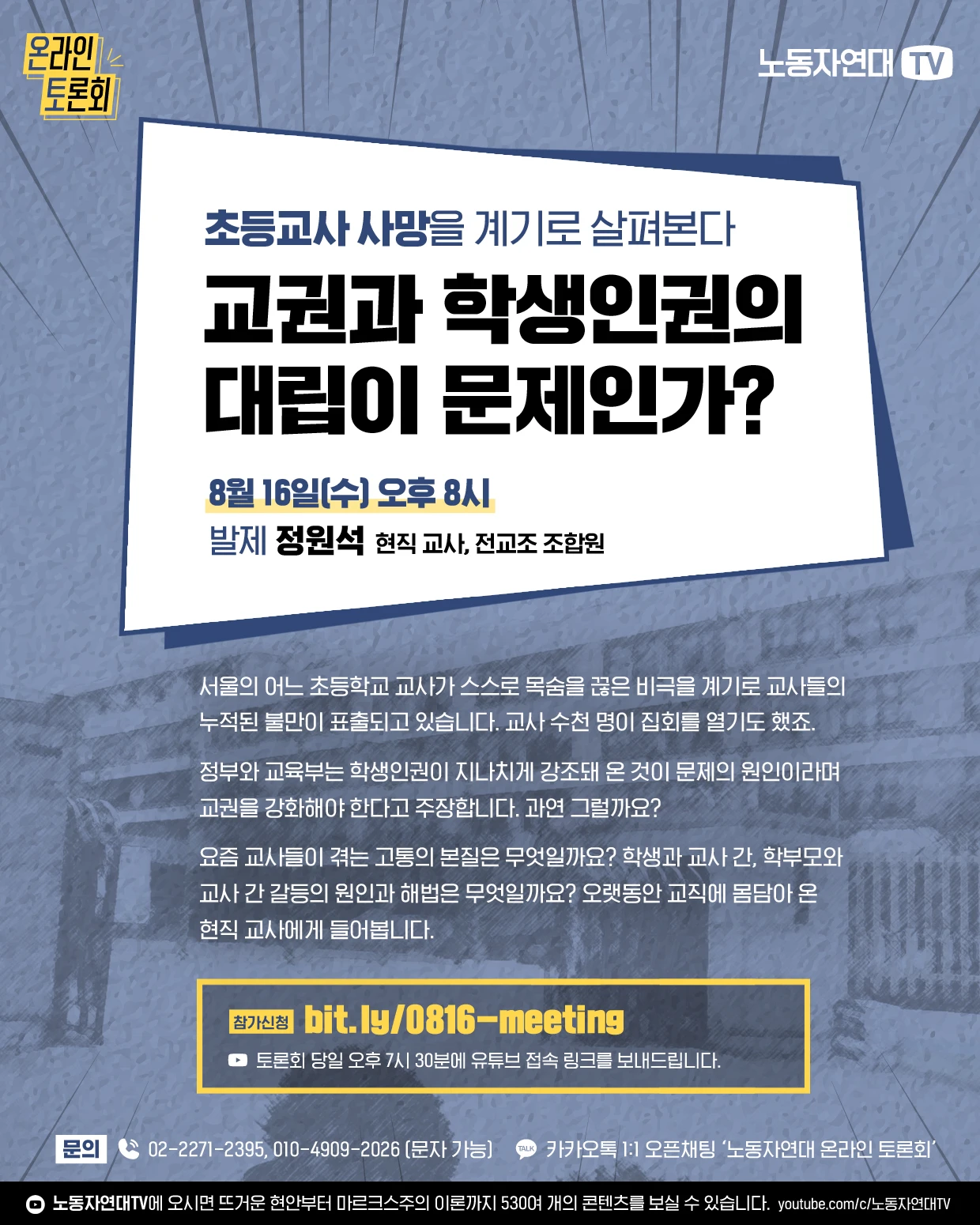 서울의 어느 초등학교 교사가 스스로 목숨을 끊은 비극을 계기로 교사들의 누적된 불만이 표출되고 있습니다. 교사 수천 명이 집회를 열기도 했죠. 정부와 교육부는 학생인권이 지나치게 강조돼 온 것이 문제의 원인이라며 교권을 강화해야 한다고 주장합니다. 과연 그럴까요? 요즘 교사들이 겪는 고통의 본질은 무엇일까요? 학생과 교사 간, 학부모와 교사 간 갈등의 원인과 해법은 무엇일까요? 오랫동안 교직에 몸담아 온 현직 교사에게 들어봅니다.