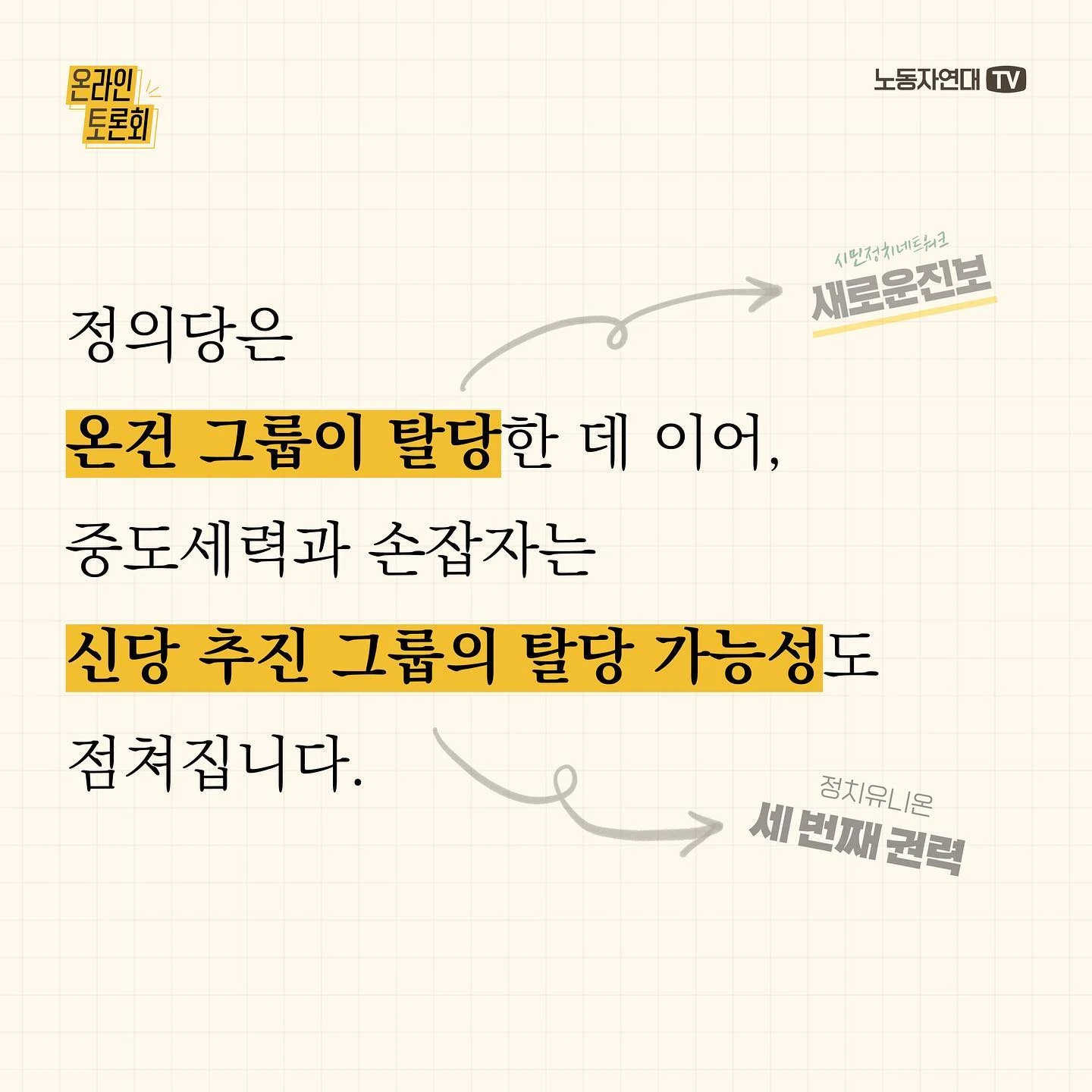 총선을 앞두고 노동계가 대응에 부심하고 있습니다. 정의당은 온건 그룹이 탈당한 데 이어, 중도세력과 손잡자는 신당 추진 그룹의 탈당 가능성도 점쳐집니다. 총선을 앞두고 정의당은 왜 이렇게 난맥상일까요? 한편 민주노총 상임집행부는 ‘노동 중심의 진보연합당’을 제안했습니다. 이 당의 성격은 무엇이고 어떻게 봐야 할까요? 총선을 앞둔 노동계 상황과 대응을 살펴보고 노동자 운동에 필요한 것은 무엇인지 토론해 봤습니다.
