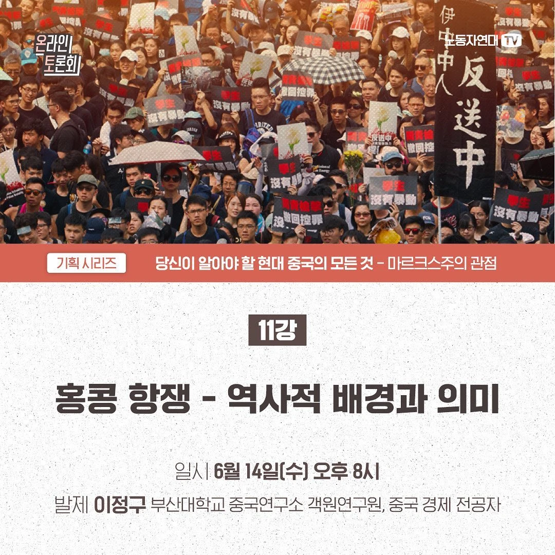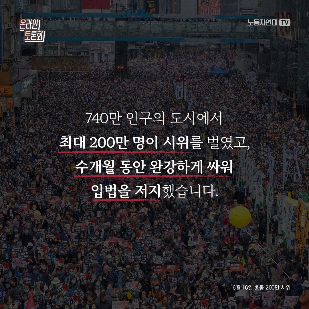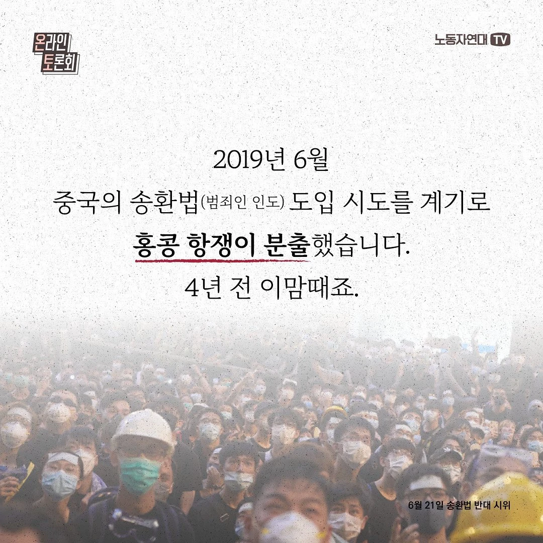 2019년 6월 중국의 송환법(범죄인 인도) 도입 시도를 계기로 홍콩 항쟁이 분출했습니다. 4년 전 이맘때죠. 740만 인구의 도시에서 최대 200만 명이 시위를 벌였고, 수개월 동안 완강하게 싸워 입법을 저지했습니다. 홍콩 대중은 왜 거리로 나왔던 것일까요? 1997년 중국 반환 이후 상황을 비롯해 2019년 홍콩 항쟁의 기원과 정치적 의미를 짚어 보고, 2020년 보안법 도입 이후 상황과 전망도 살펴보려 합니다.