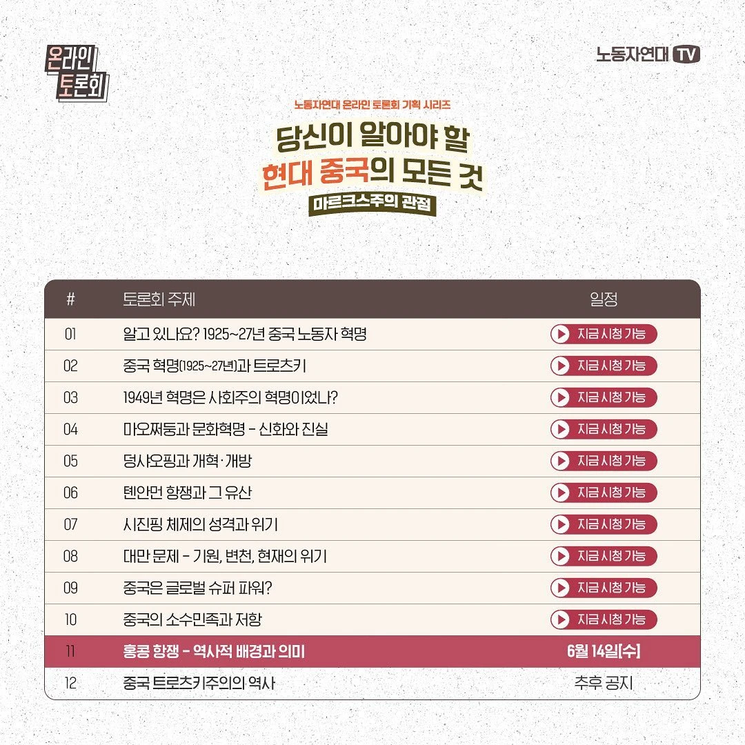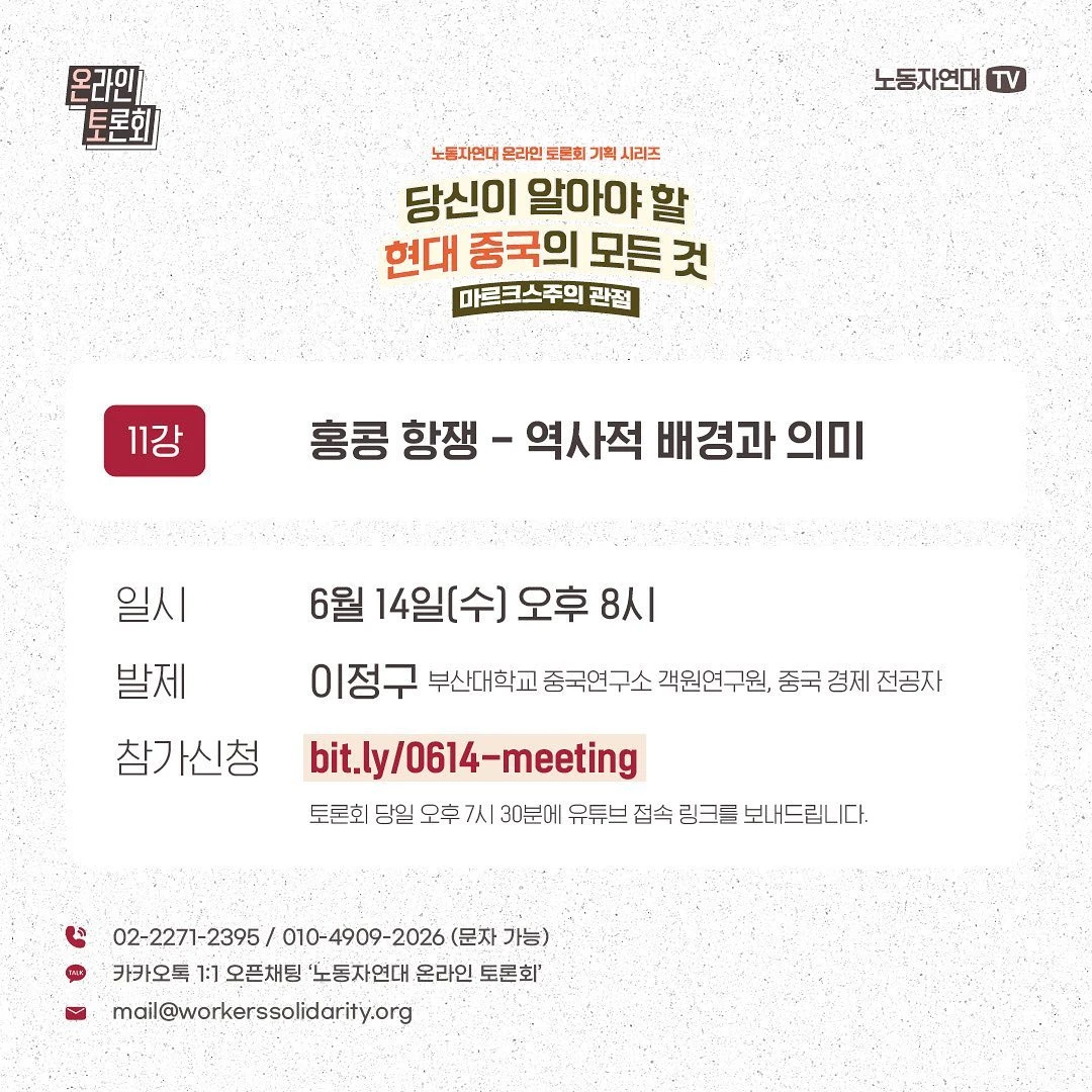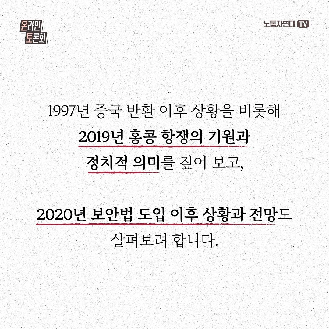 2019년 6월 중국의 송환법(범죄인 인도) 도입 시도를 계기로 홍콩 항쟁이 분출했습니다. 4년 전 이맘때죠. 740만 인구의 도시에서 최대 200만 명이 시위를 벌였고, 수개월 동안 완강하게 싸워 입법을 저지했습니다. 홍콩 대중은 왜 거리로 나왔던 것일까요? 1997년 중국 반환 이후 상황을 비롯해 2019년 홍콩 항쟁의 기원과 정치적 의미를 짚어 보고, 2020년 보안법 도입 이후 상황과 전망도 살펴보려 합니다.