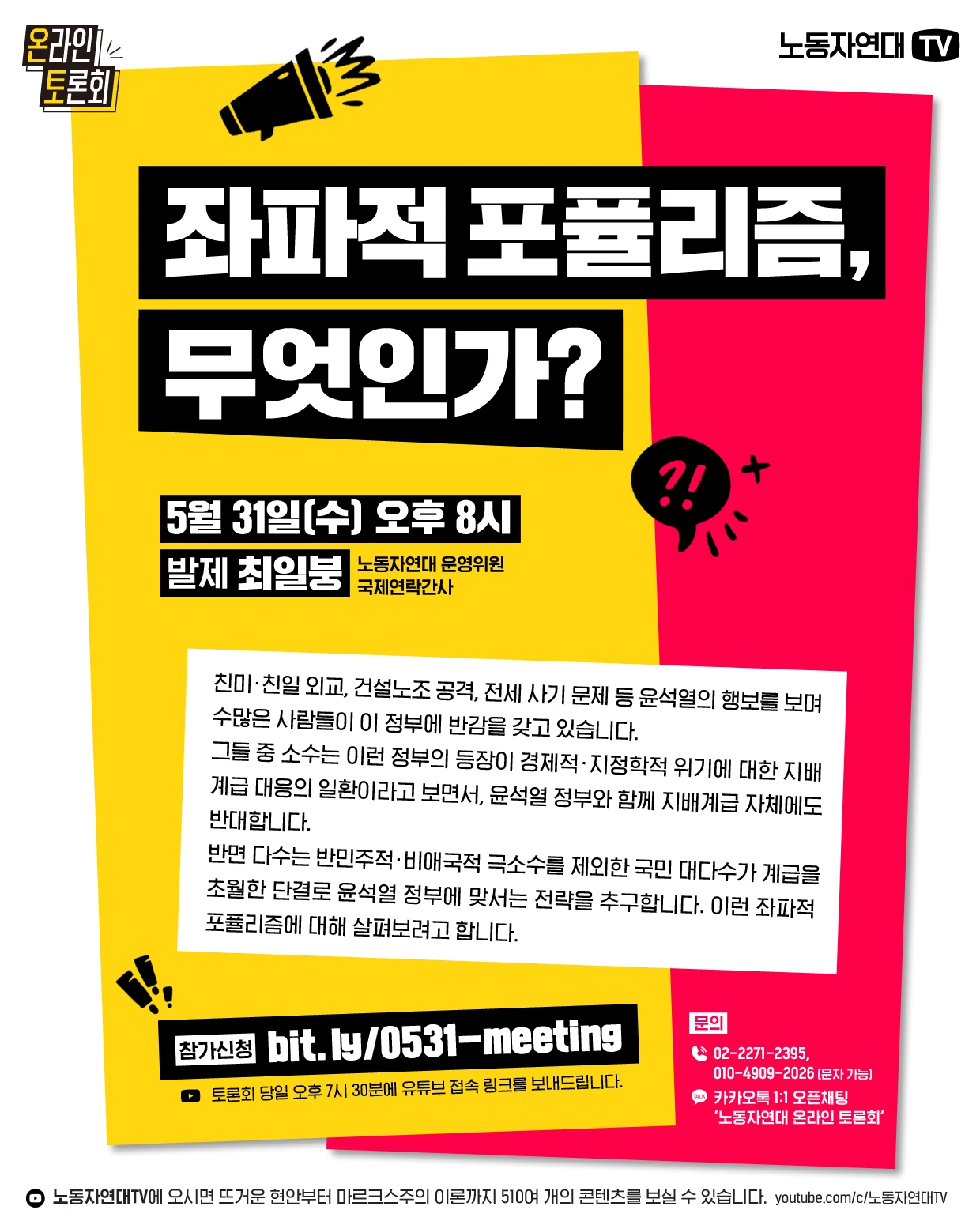친미·친일 외교, 건설노조 공격, 전세 사기 문제 등 윤석열의 행보를 보며 수많은 사람들이 이 정부에 반감을 갖고 있습니다. 그들 중 소수는 이런 정부의 등장이 경제적·지정학적 위기에 대한 지배계급 대응의 일환이라고 보면서, 윤석열 정부와 함께 지배계급 자체에도 반대합니다. 반면 다수는 반민주적∙비애국적 극소수를 제외한 국민 대다수가 계급을 초월한 단결로 윤석열 정부에 맞서는 전략을 추구합니다. 이런 좌파적 포퓰리즘에 대해 살펴보려고 합니다.