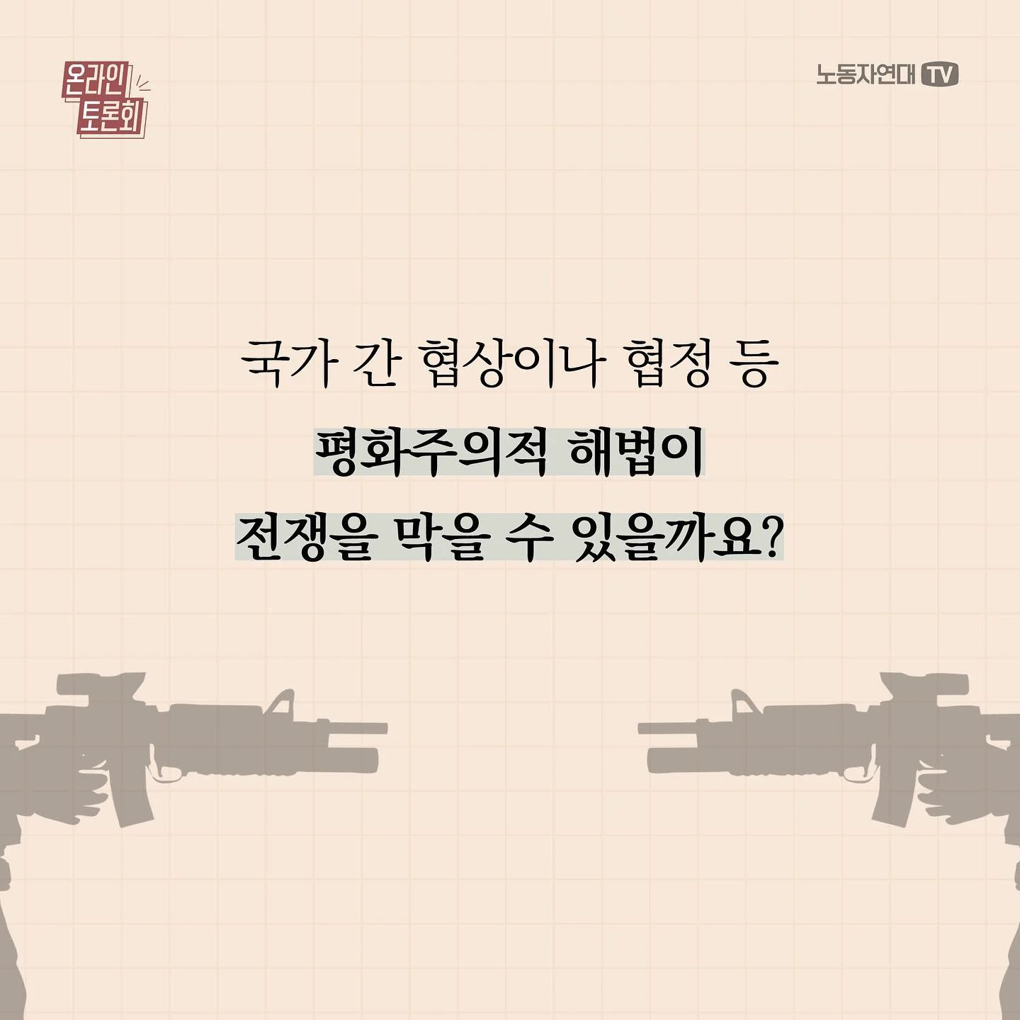 우크라이나 전쟁을 비롯해 세계 도처에서 전쟁이 끊이지 않습니다. 한반도에서도 전쟁 위기가 거듭됐죠. 전쟁을 반대하는 운동에 어떤 전략과 전망이 필요할까요? 민주당과 주요 좌파 단체들은 정상회담이나 평화협정 체결을 요구합니다. 국가 간 협상이나 협정 등 평화주의적 해법이 전쟁을 막을 수 있을까요? 마르크스주의와 평화주의의 공통점과 차이점, 평화주의 사상과 운동의 한계를 살펴봅니다.