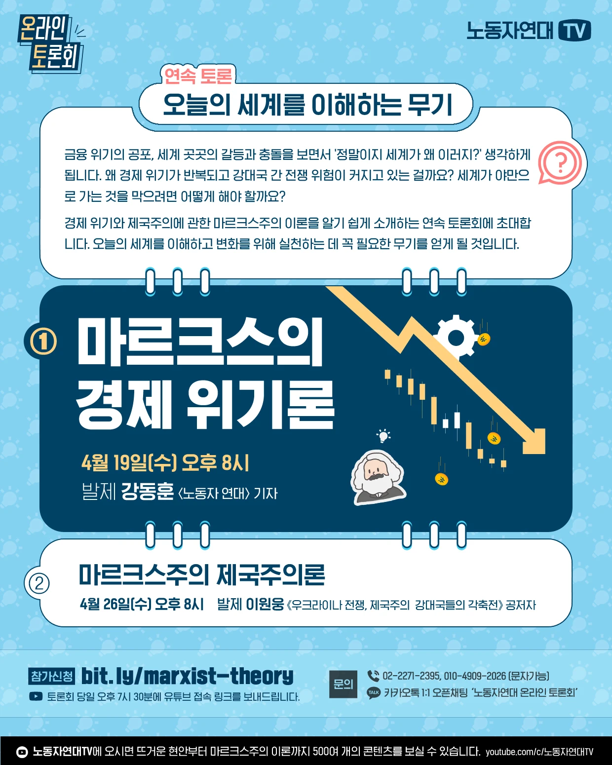 금융 위기의 공포, 세계 곳곳의 갈등과 충돌을 보면서 ‘정말이지 세계가 왜 이러지?’ 생각하게 됩니다. 왜 경제 위기가 반복되고 강대국 간 전쟁 위험이 커지고 있는 걸까요? 세계가 야만으로 가는 것을 막으려면 어떻게 해야 할까요? 경제 위기와 제국주의에 관한 마르크스주의 이론을 알기 쉽게 소개하는 연속 토론회에 초대합니다. 오늘의 세계를 이해하고 변화를 위해 실천하는 데 꼭 필요한 무기를 얻게 될 것입니다.